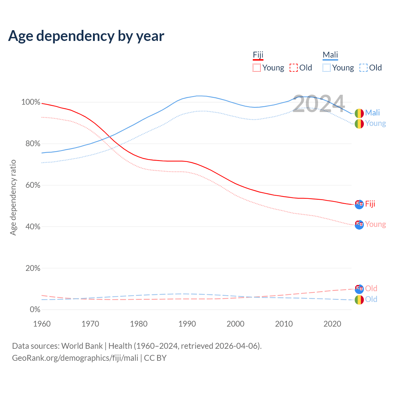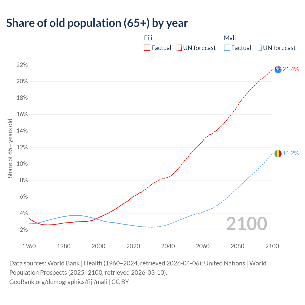 - The share of old-age demographic (65+) in Fiji is 6.49% vs 2.38% in Mali.
