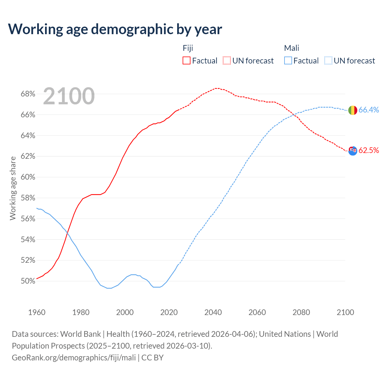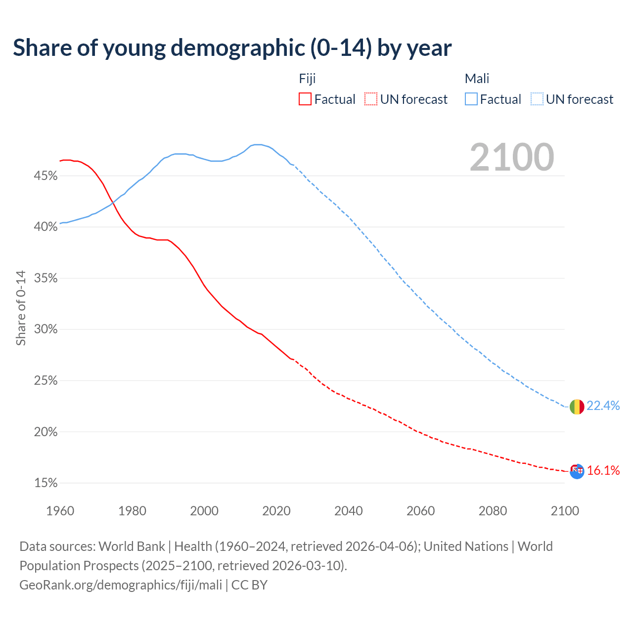 - The share of young demographic (0-15 years old) in Fiji is 27.1% vs 46.1% in Mali.