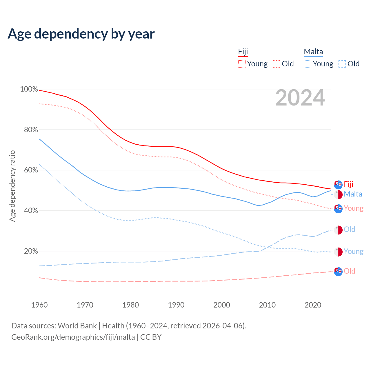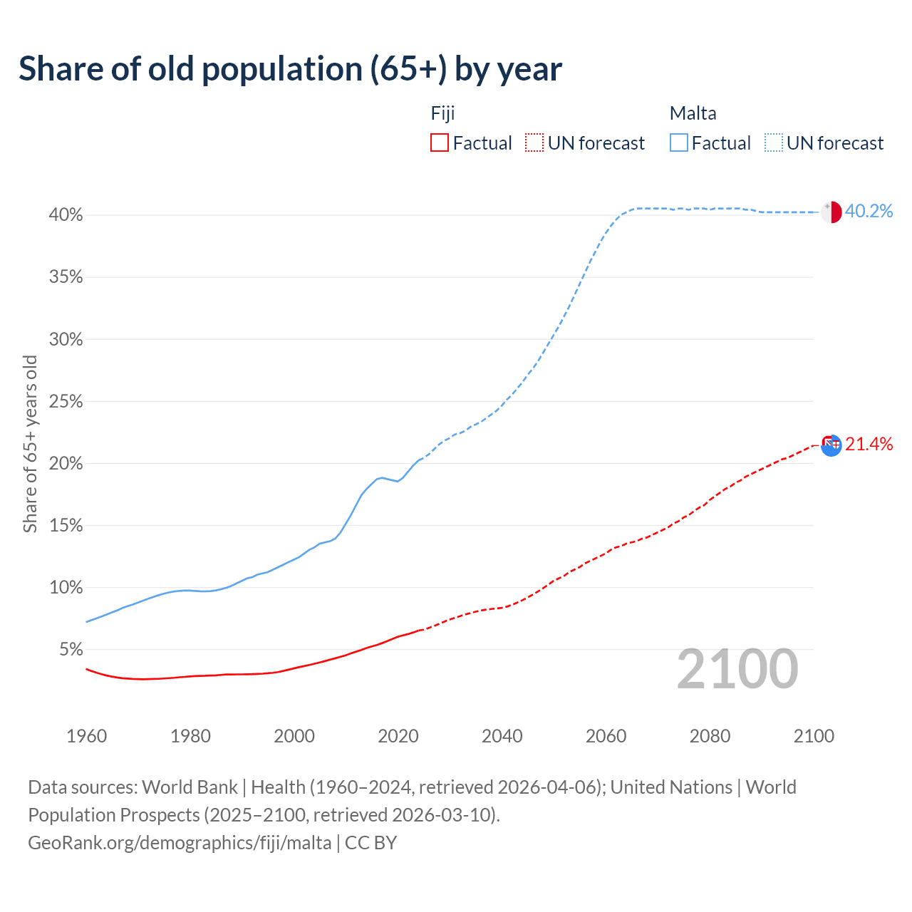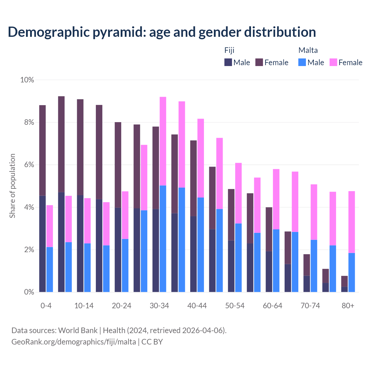 - The share of old-age demographic (65+) in Fiji is 6.49% vs 20.2% in Malta.