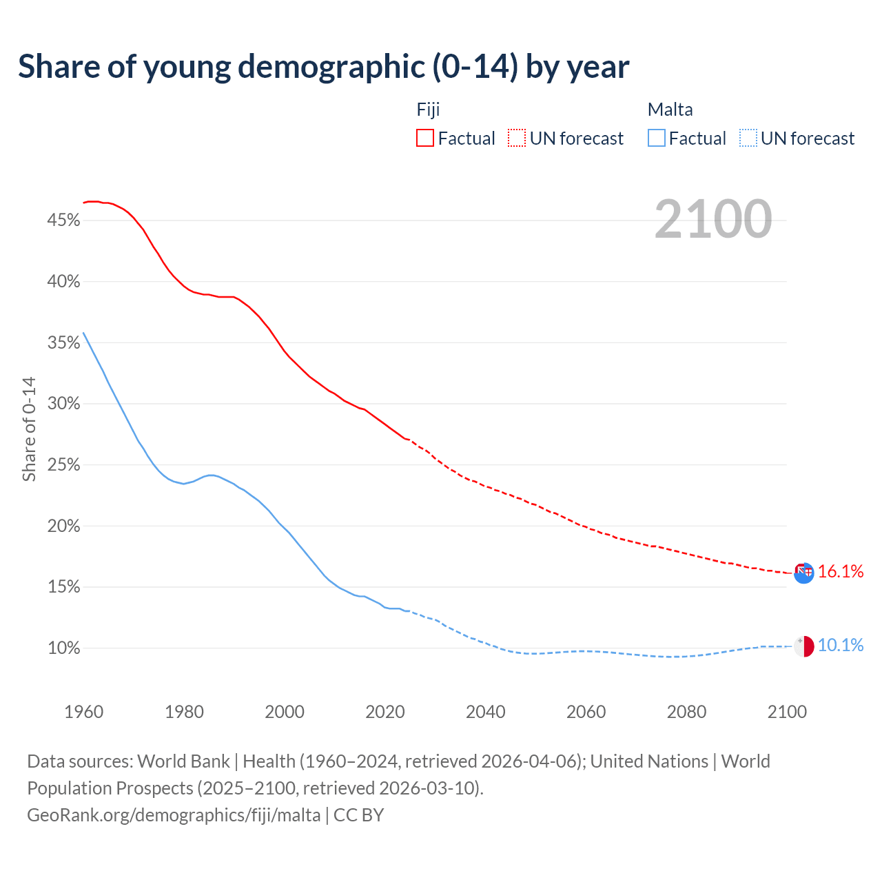 - The share of young demographic (0-15 years old) in Fiji is 27.1% vs 13% in Malta.