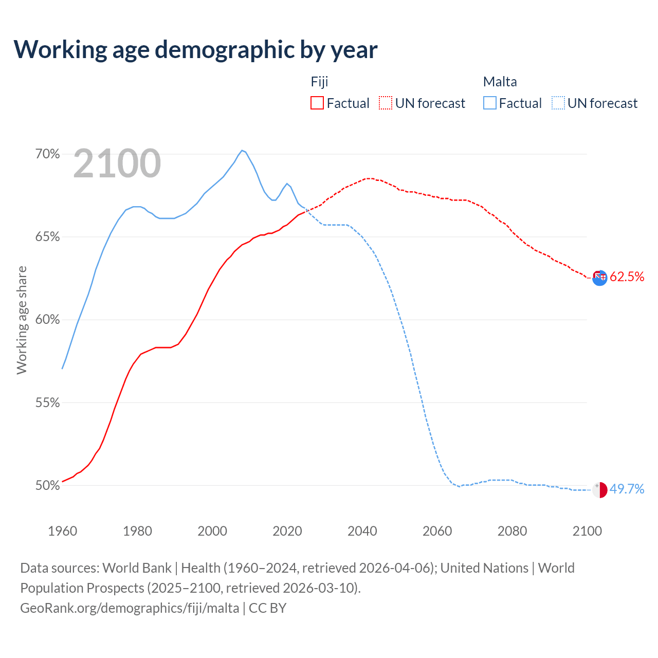 Median age Fiji vs Malta, 1960-2100