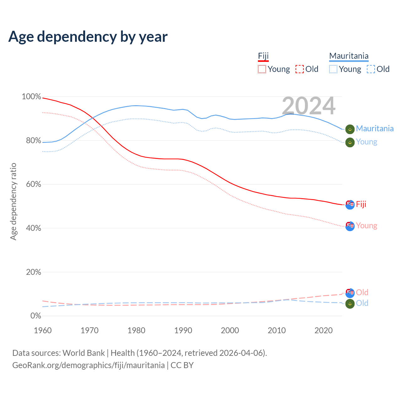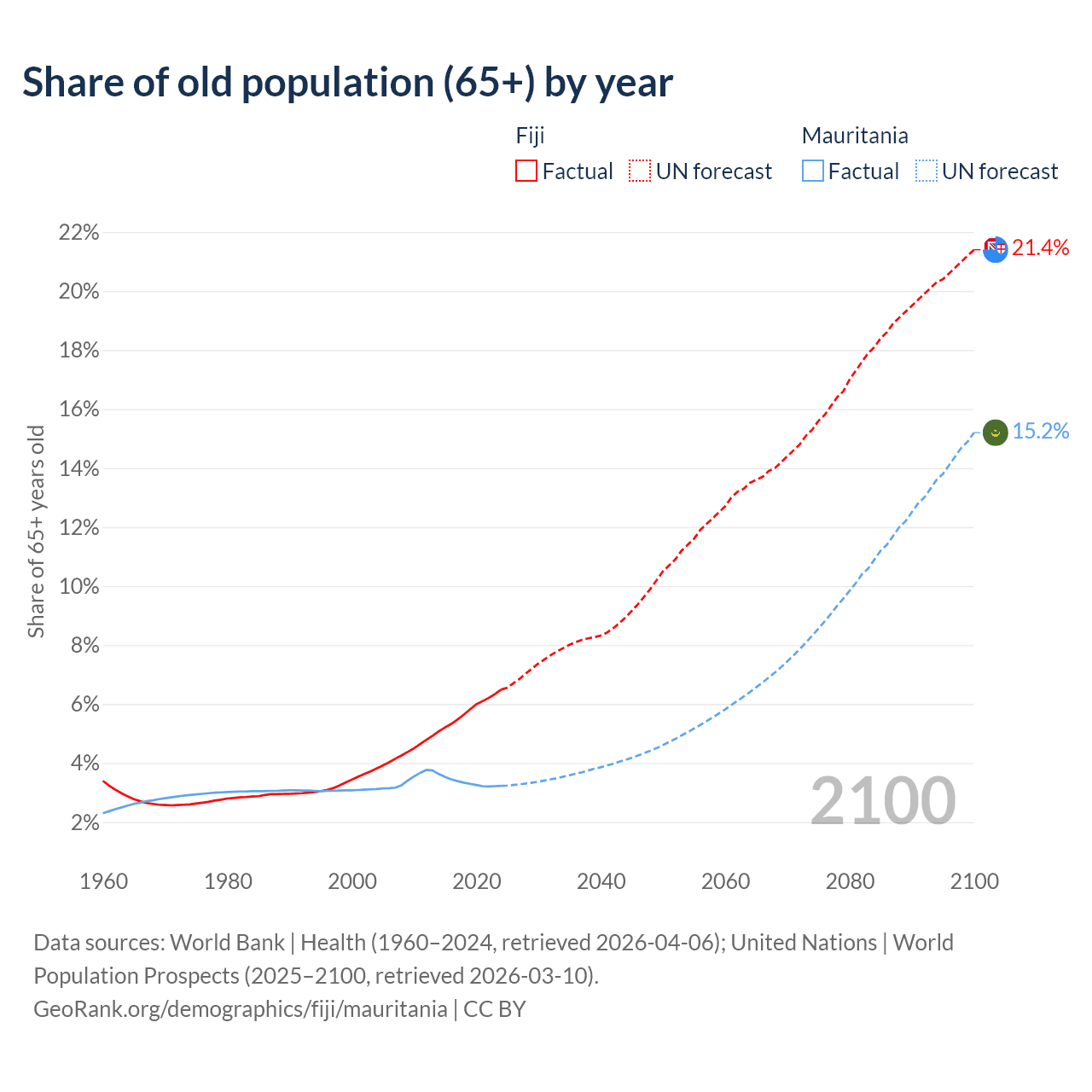 - The share of old-age demographic (65+) in Fiji is 6.49% vs 3.23% in Mauritania.