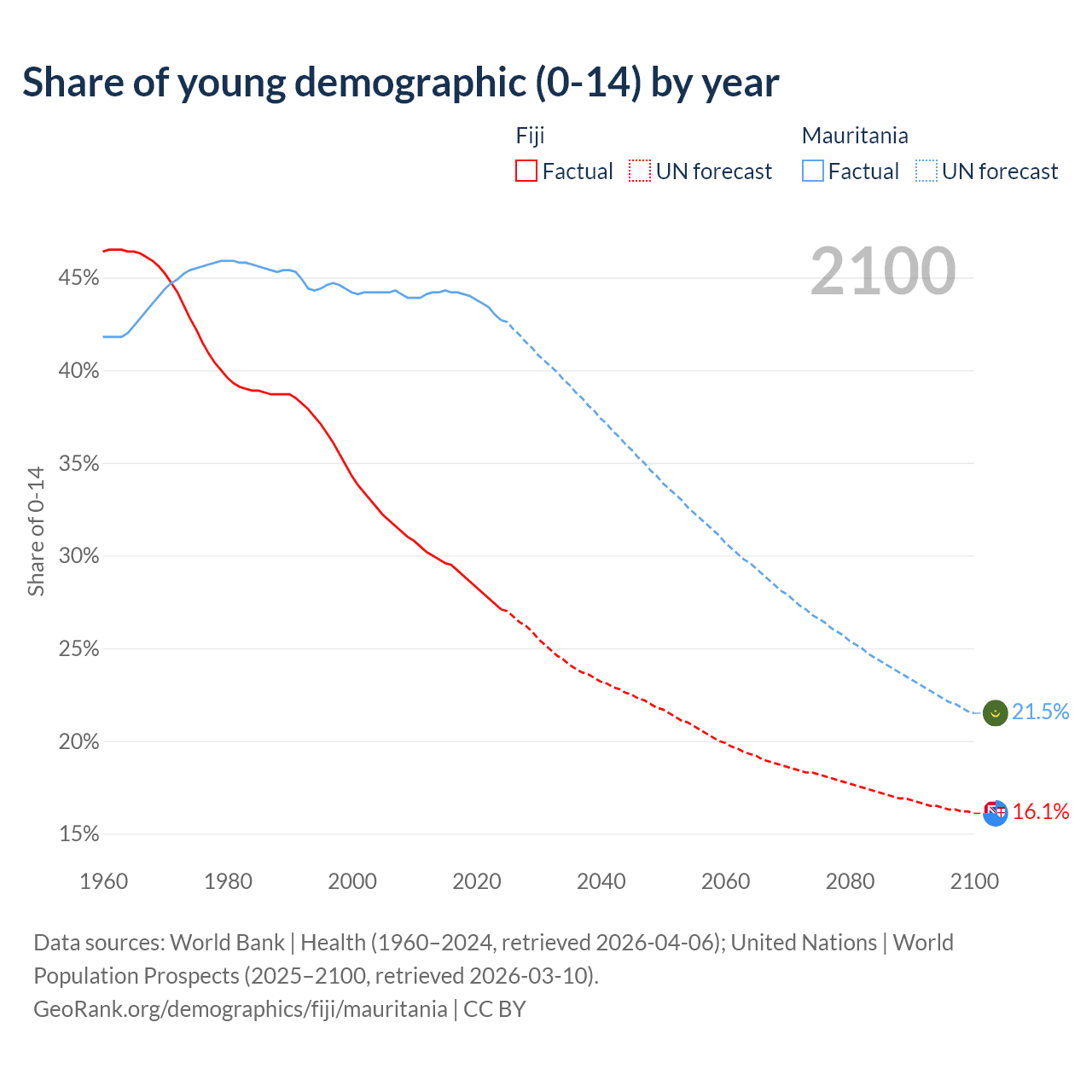 - The share of young demographic (0-15 years old) in Fiji is 27.1% vs 42.7% in Mauritania.