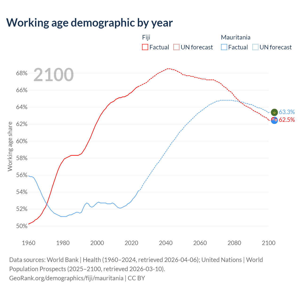 - Fiji has 623K working age adults (aged 15-64) vs 2.98M in Mauritania.