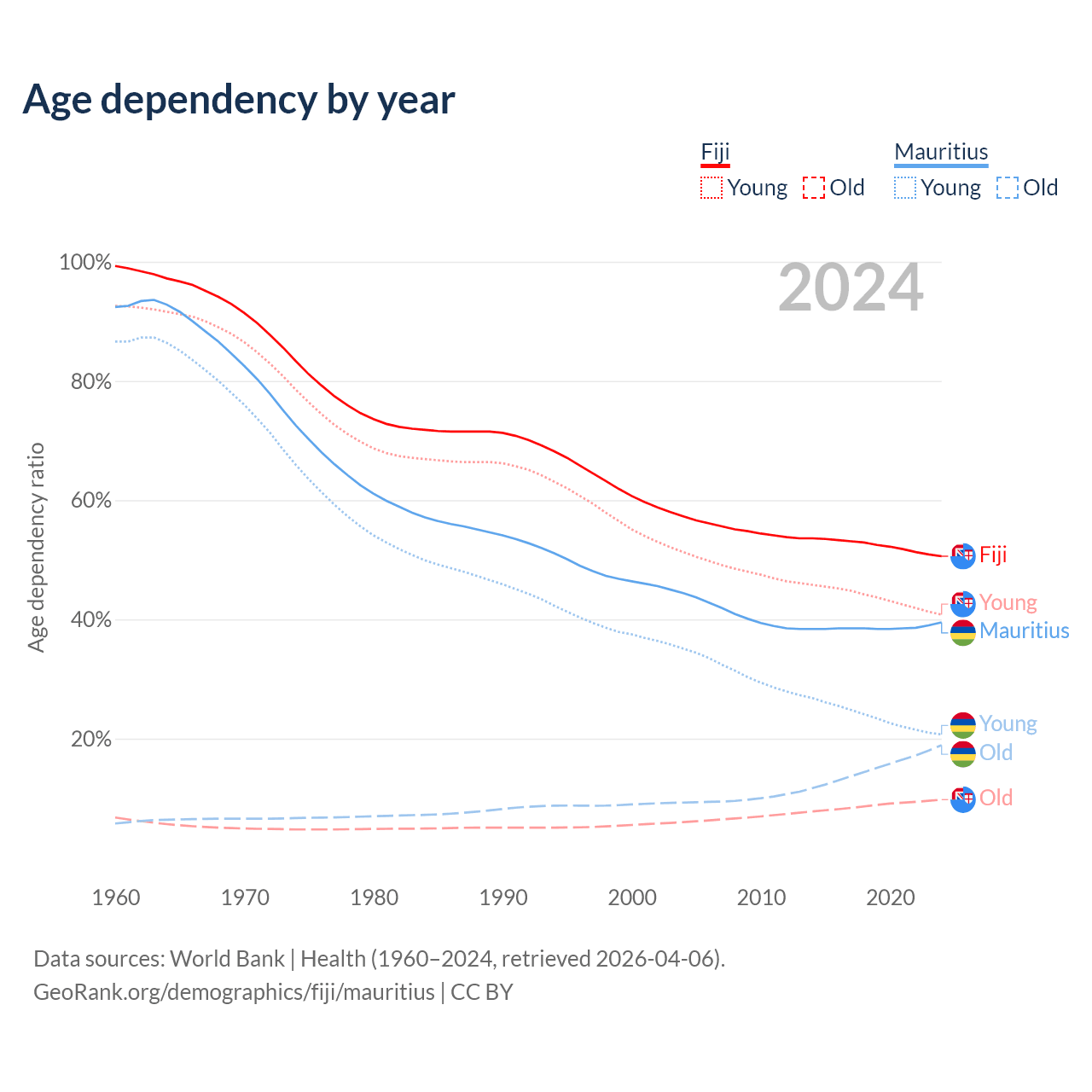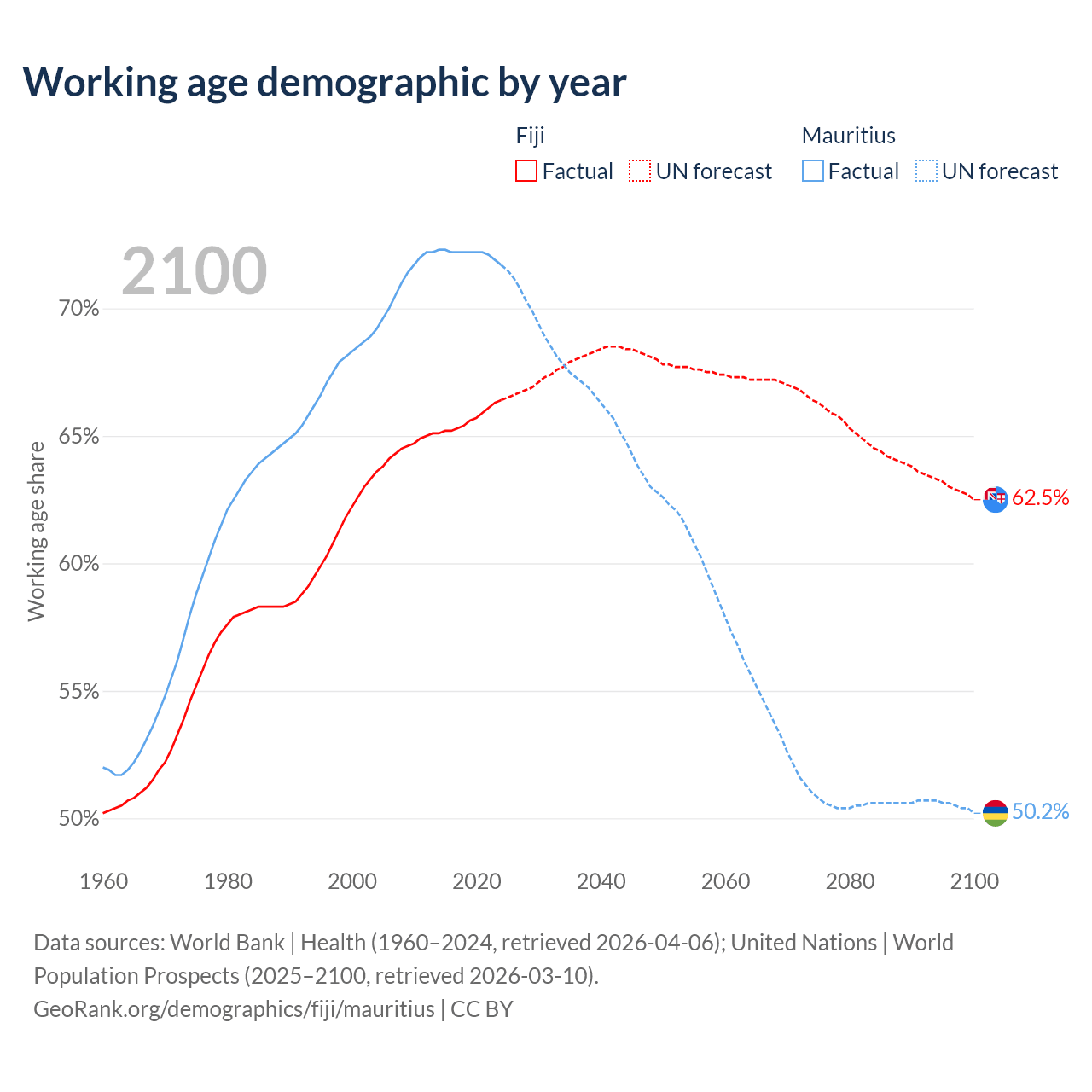 The share of older people aged 65 and over is 6.49% in Fiji and 13.5% in Mauritius. Life expectancy in Fiji compared to Mauritius .