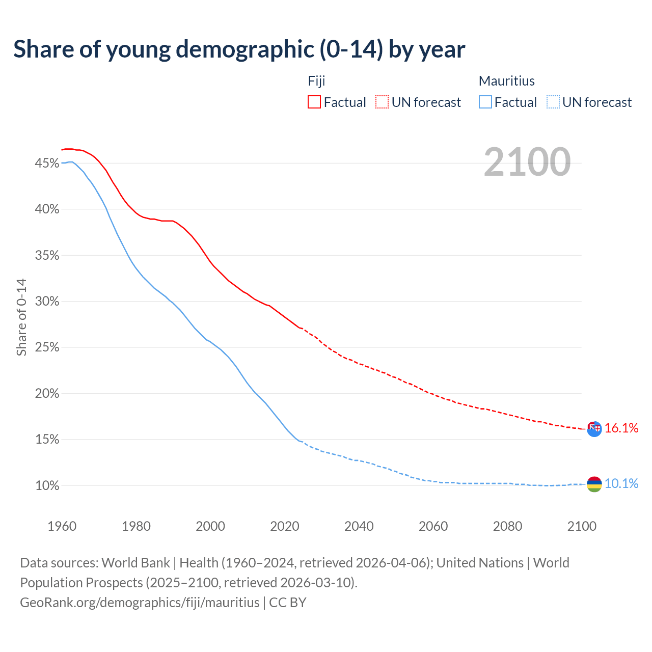 - The share of young demographic (0-15 years old) in Fiji is 27.1% vs 14.8% in Mauritius.