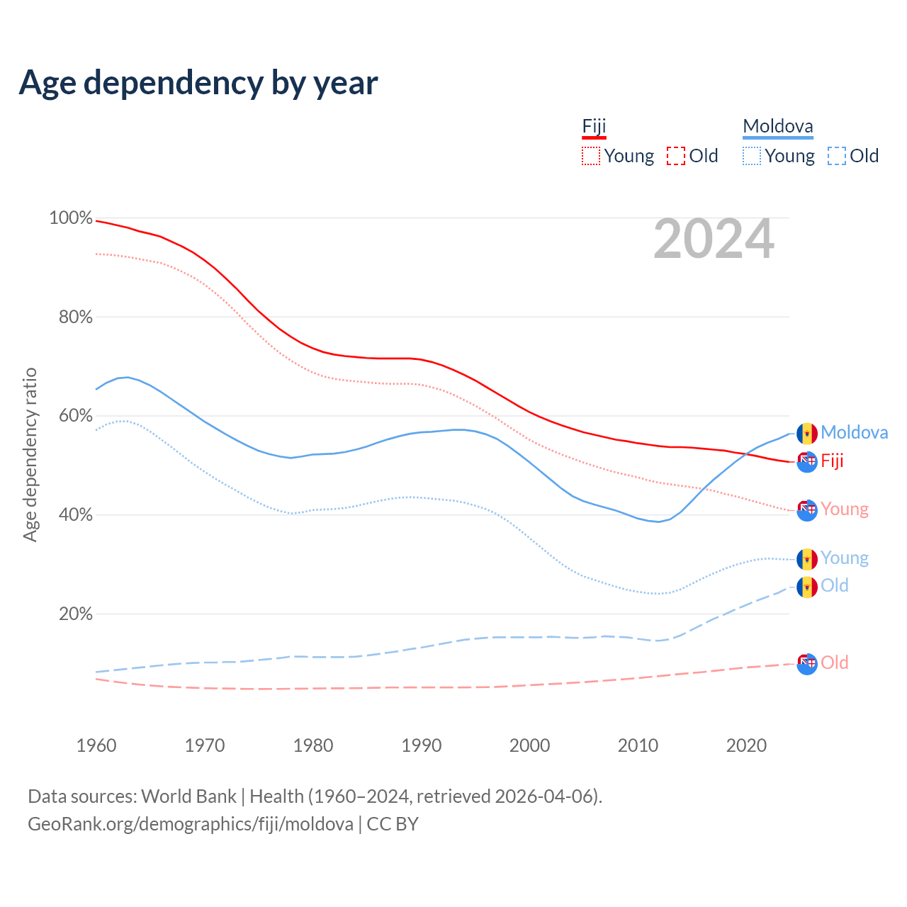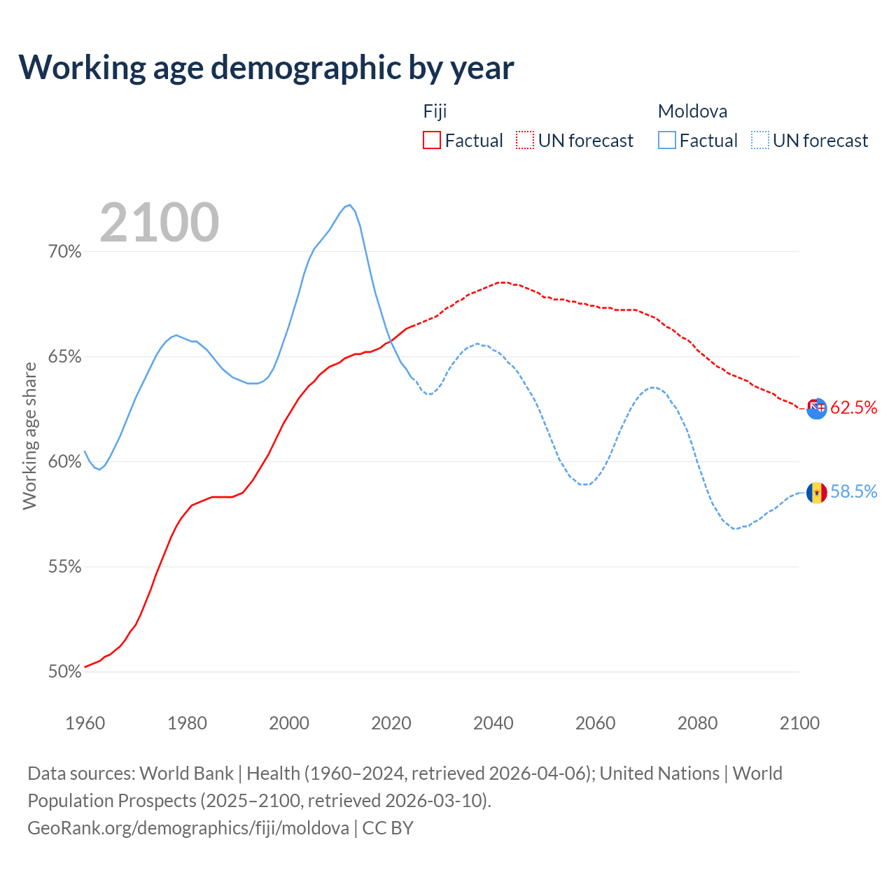 - The share of old-age demographic (65+) in Fiji is 6.49% vs 16.2% in Moldova.