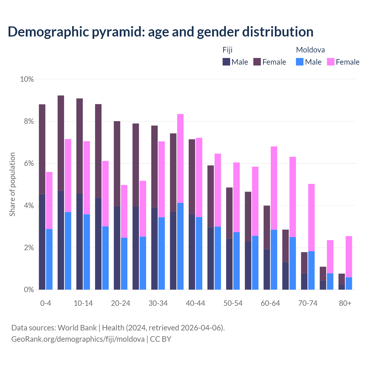 - Fiji is ranked 113/196 by median age (oldest to youngest) vs 54/196 for Moldova.