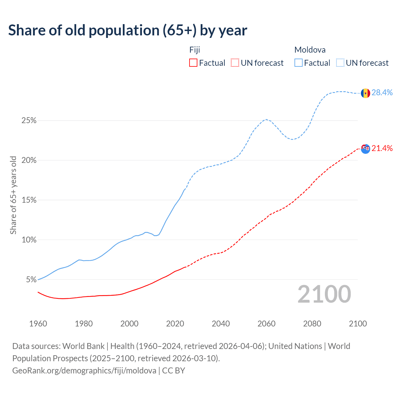 The share of older people aged 65 and over is 6.49% in Fiji and 16.2% in Moldova. Life expectancy in Fiji compared to Moldova .