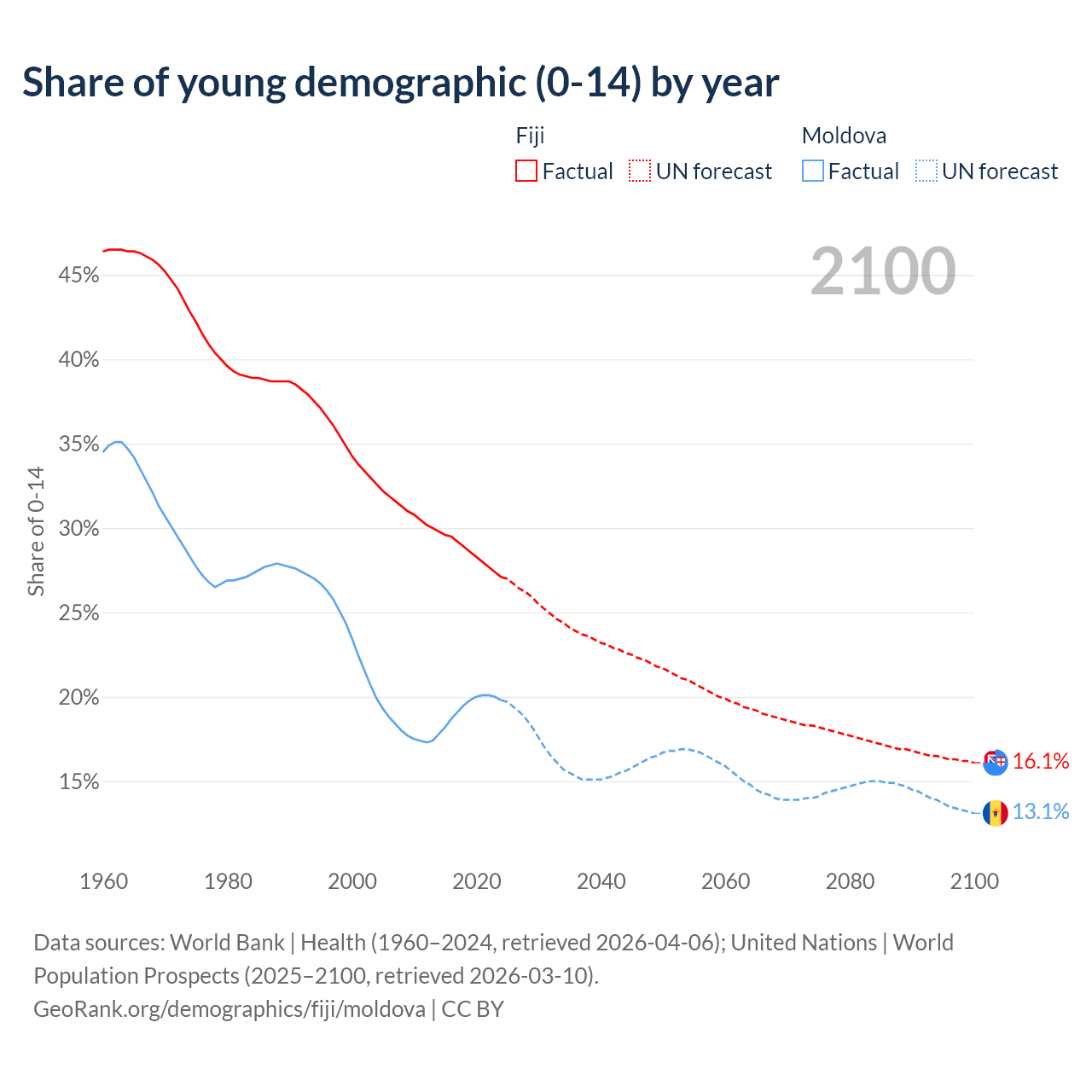 - The share of young demographic (0-15 years old) in Fiji is 27.1% vs 19.8% in Moldova.