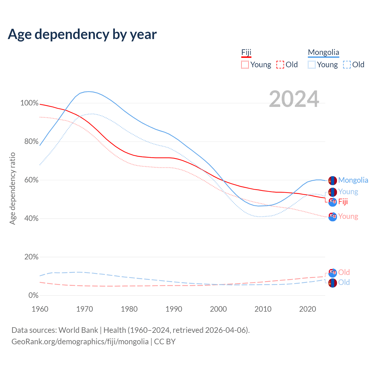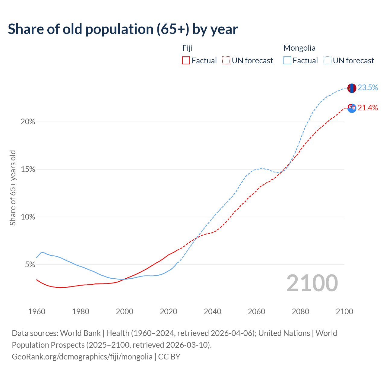 - The share of old-age demographic (65+) in Fiji is 6.49% vs 5.14% in Mongolia.