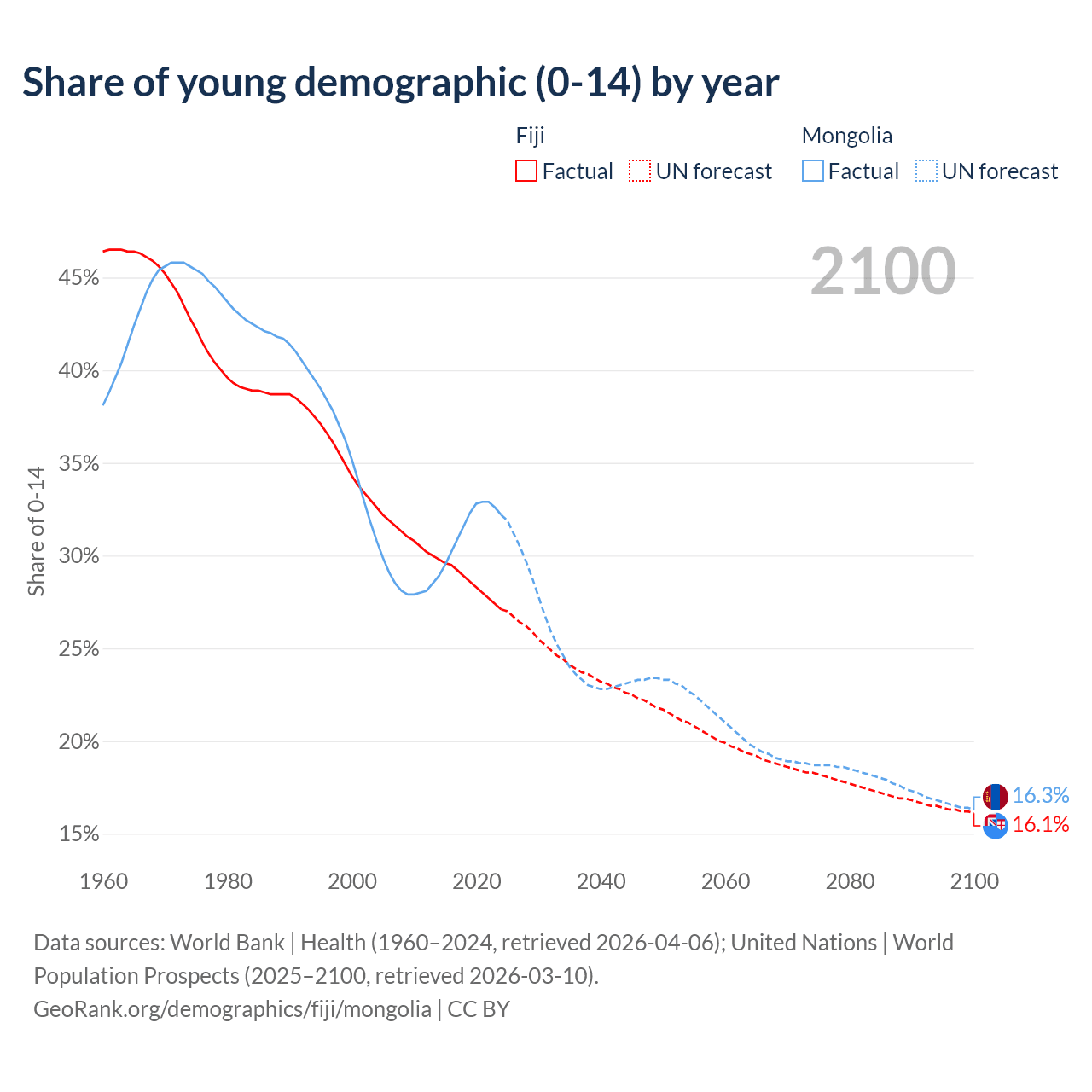 - The share of young demographic (0-15 years old) in Fiji is 27.1% vs 32.2% in Mongolia.