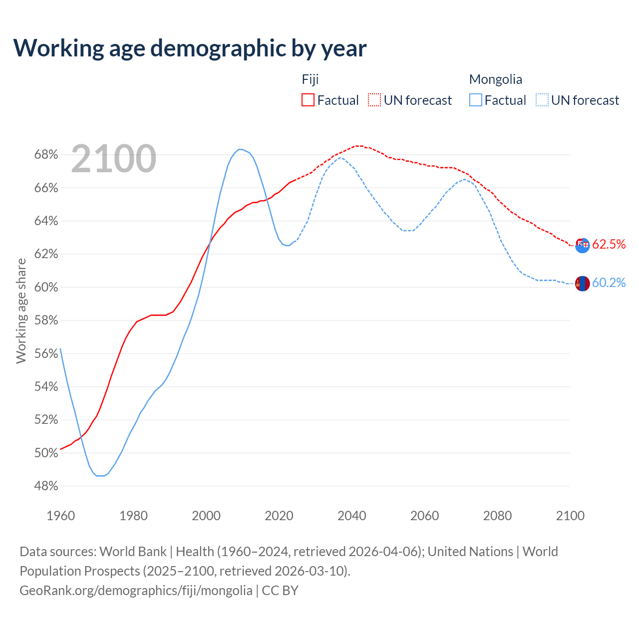- Fiji has 623K working age adults (aged 15-64) vs 2.27M in Mongolia.