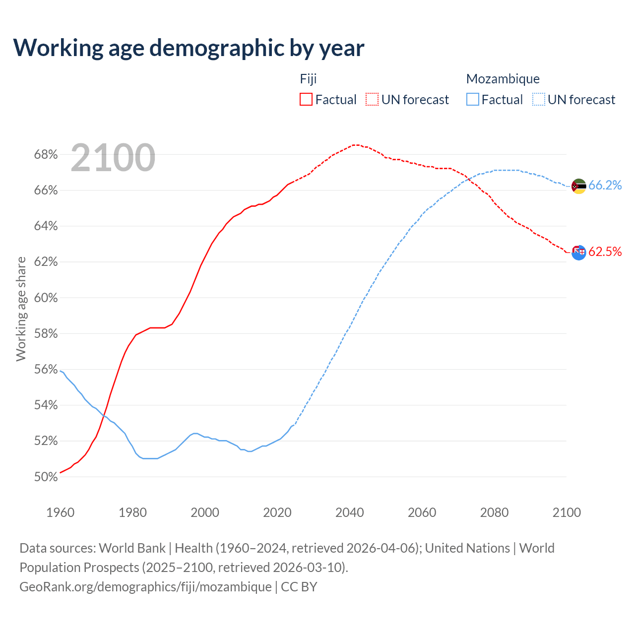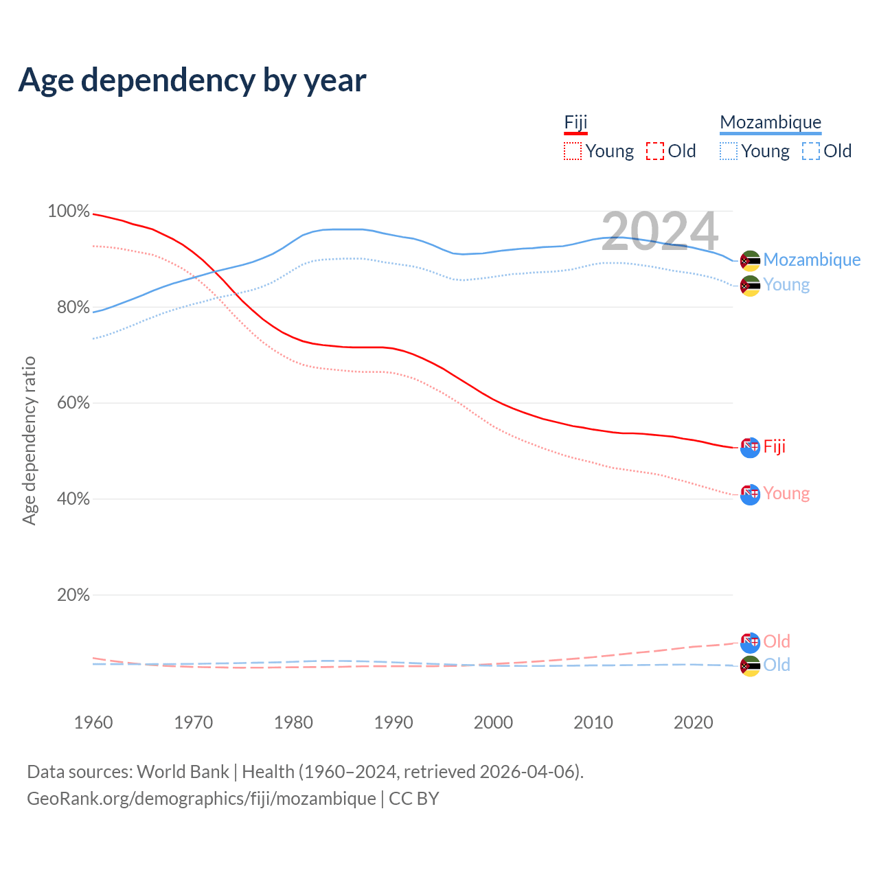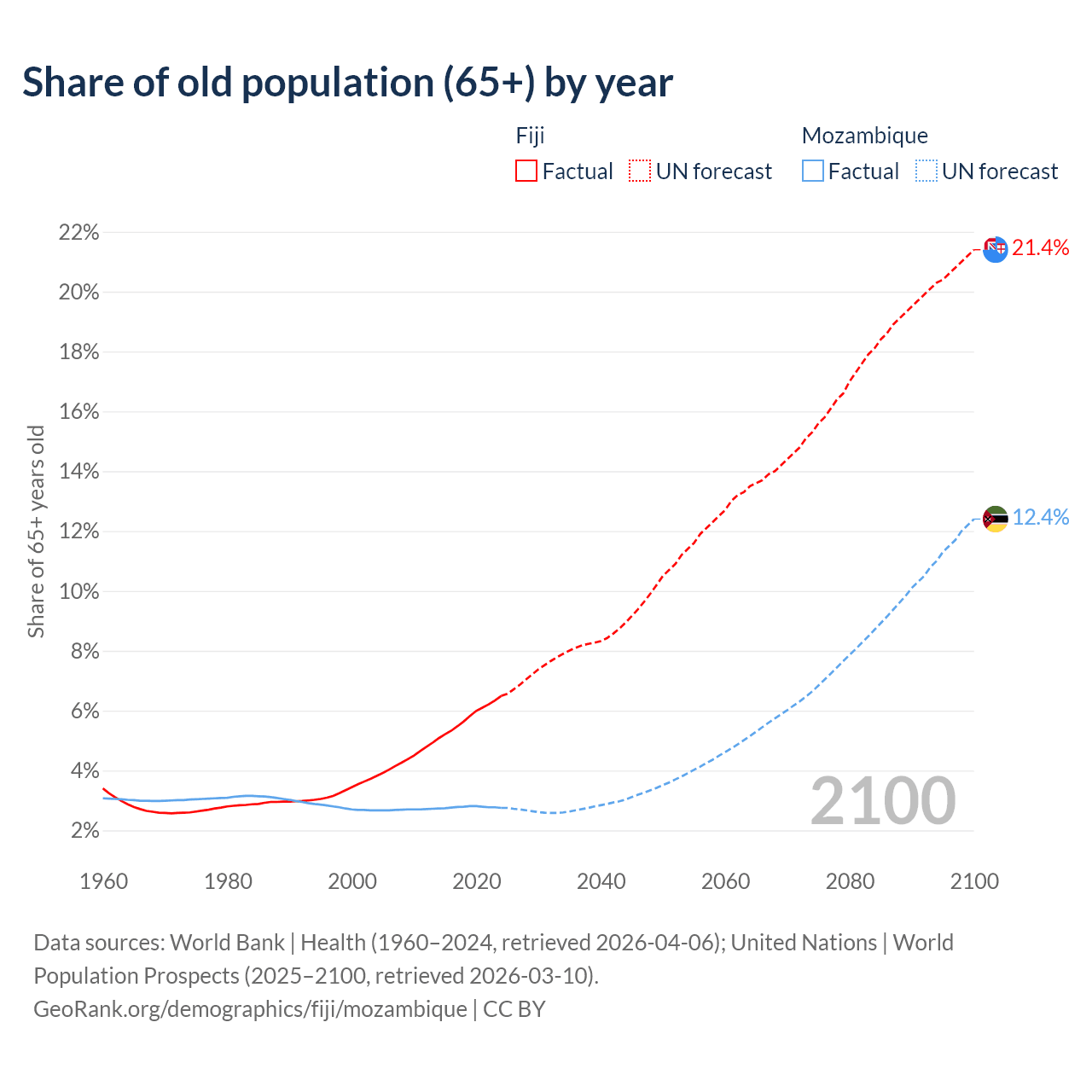- The share of old-age demographic (65+) in Fiji is 6.49% vs 2.75% in Mozambique.