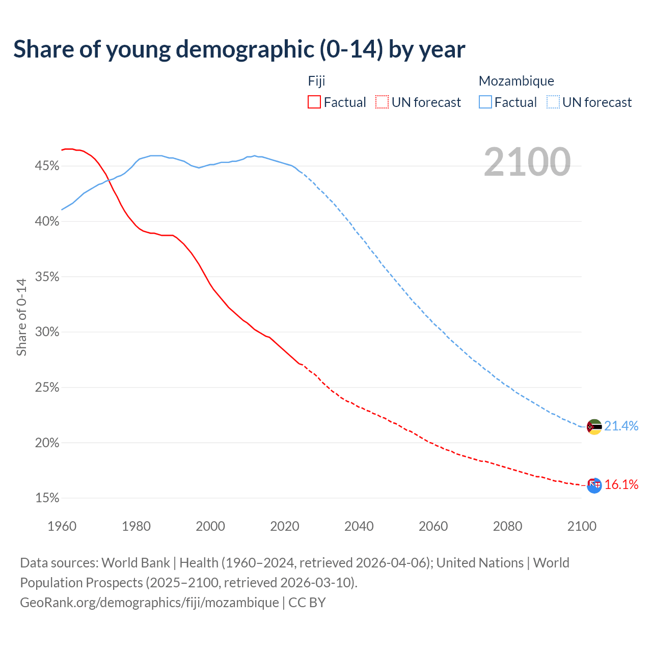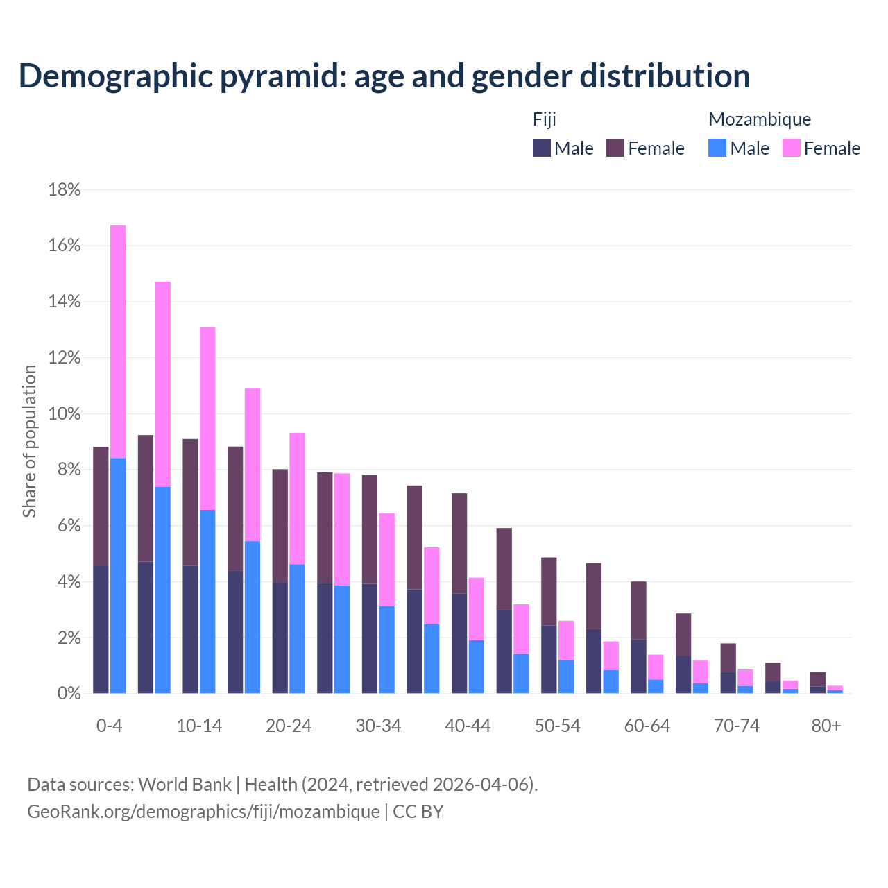 - The share of young demographic (0-15 years old) in Fiji is 27.1% vs 44.5% in Mozambique.