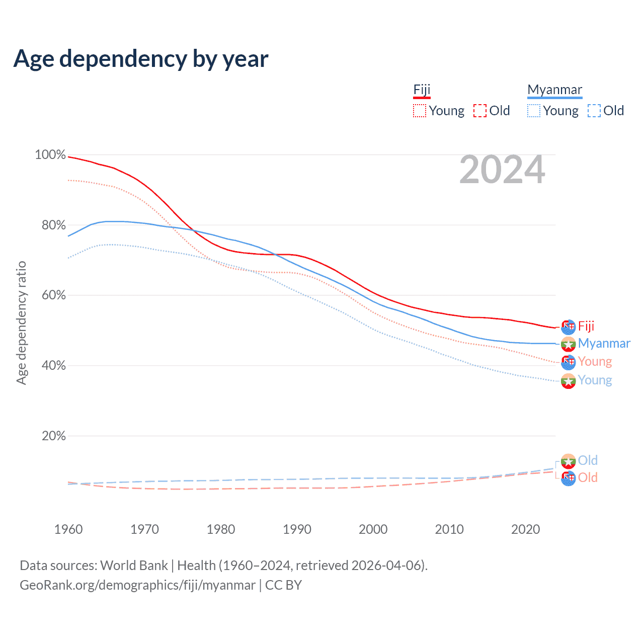 Data sources: World Bank | Health (1960–2024, retrieved 2026-04-06); U.S. Census Bureau (1960–2024, retrieved 2026-02-08).