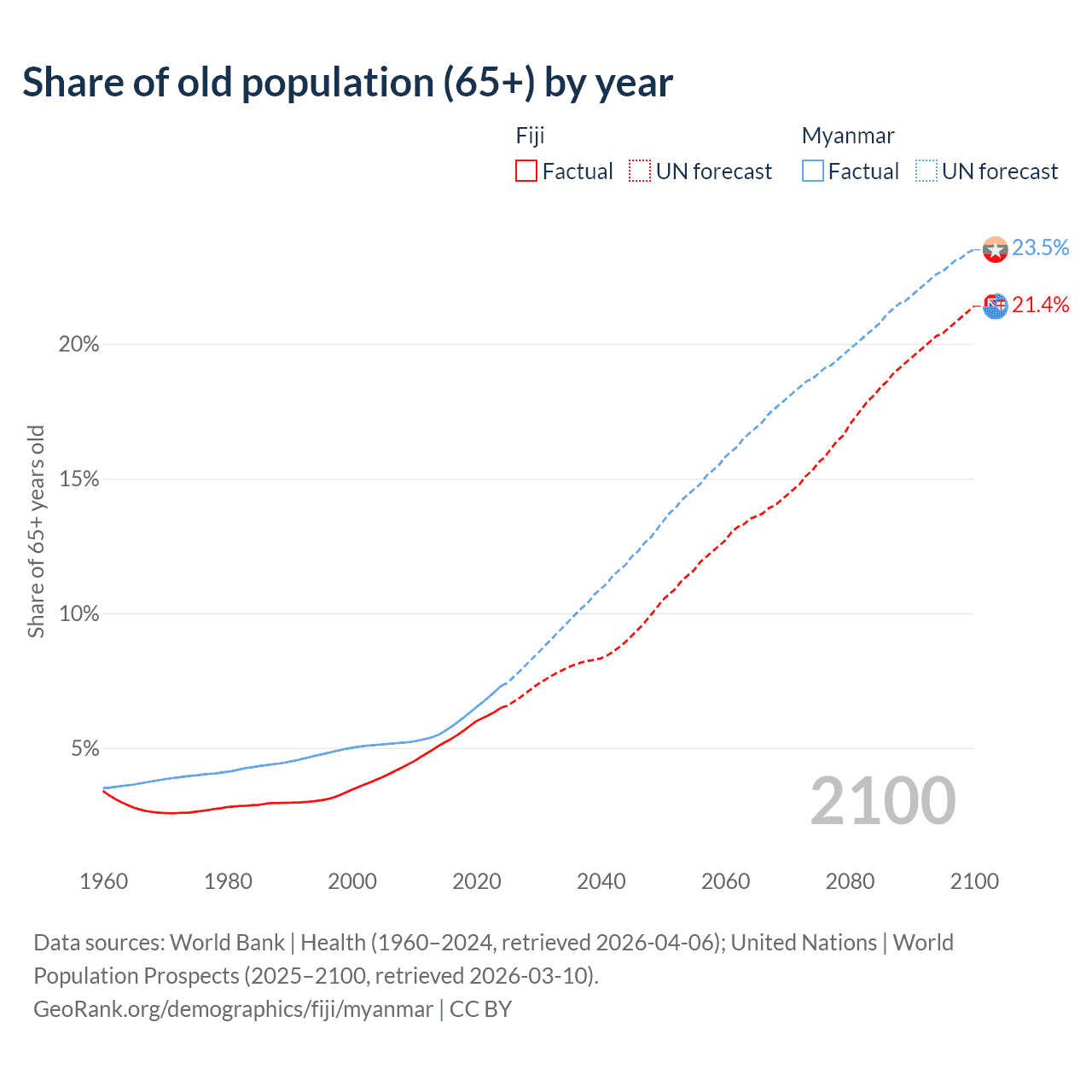 The share of older people aged 65 and over is 6.49% in Fiji and 7.3% in Myanmar. Life expectancy in Fiji compared to Myanmar .