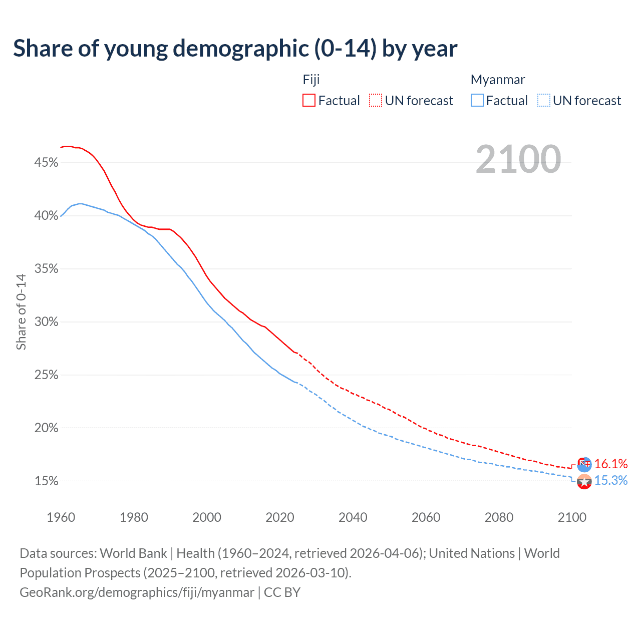 - The share of young demographic (0-15 years old) in Fiji is 27.1% vs 24.3% in Myanmar.