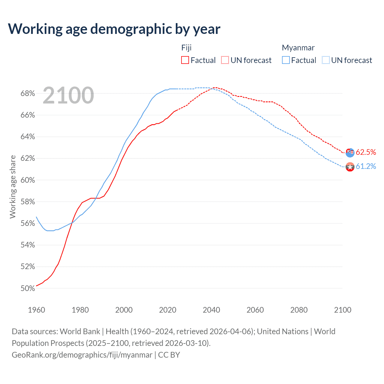 Median age Fiji vs Myanmar, 1960-2100