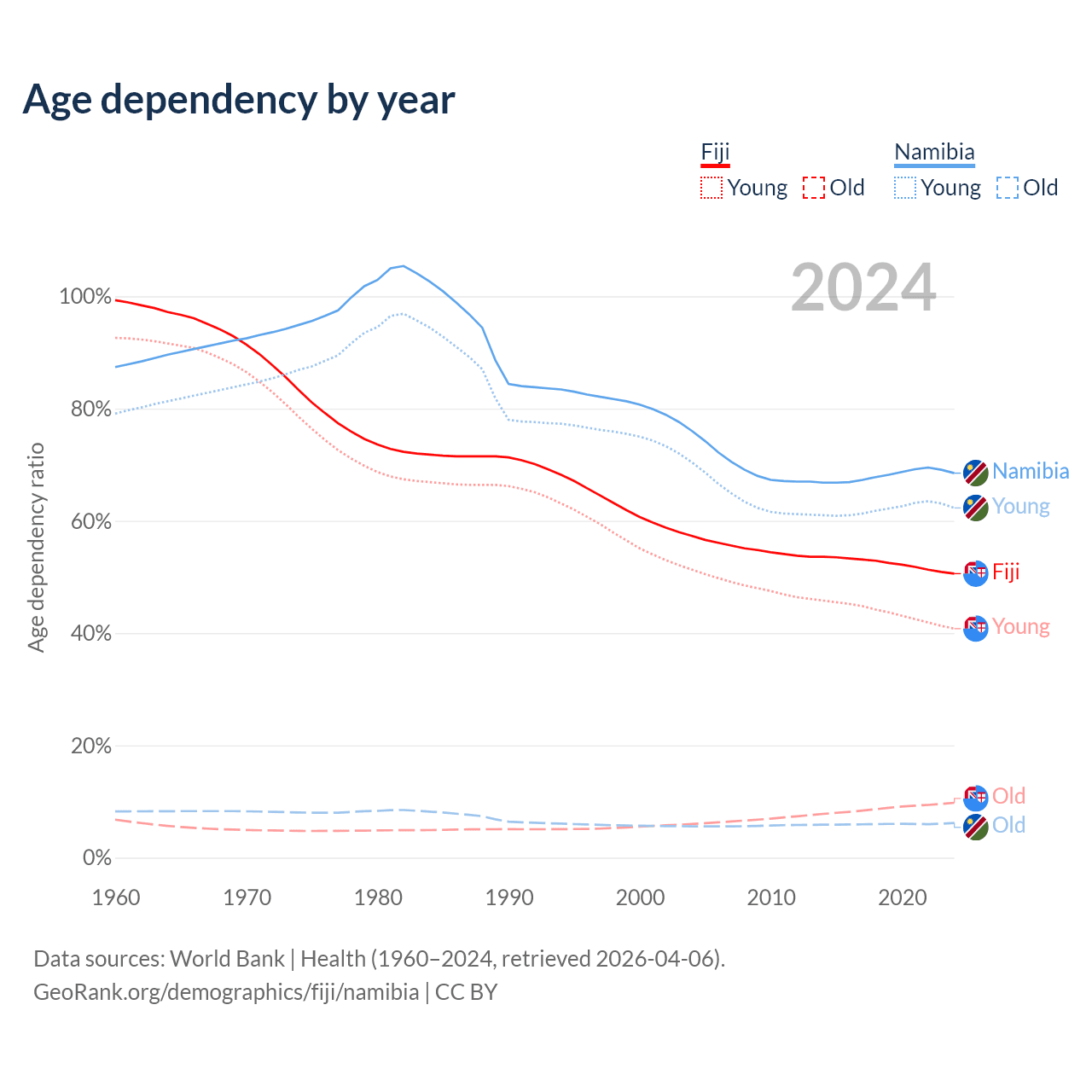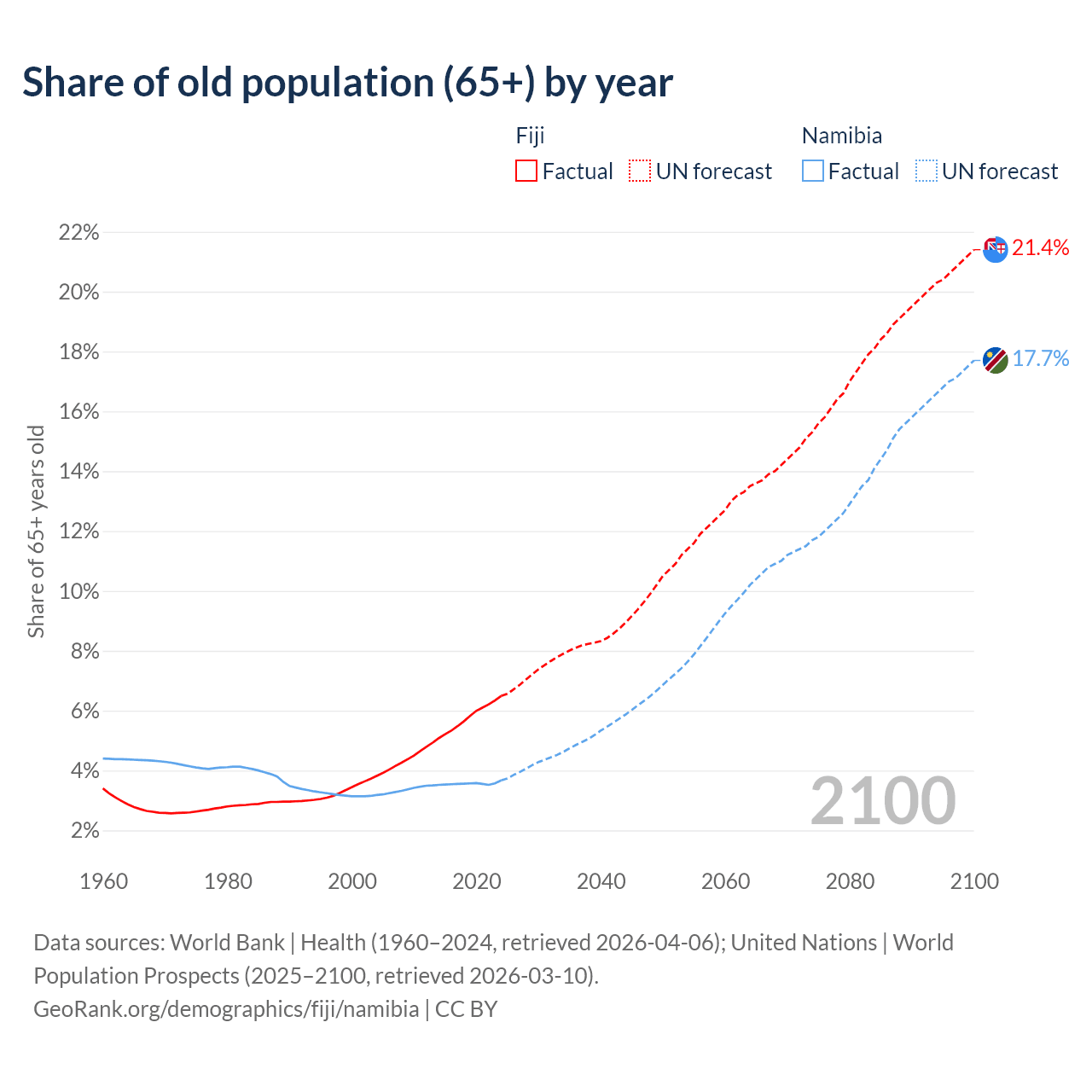 - The share of old-age demographic (65+) in Fiji is 6.49% vs 3.67% in Namibia.