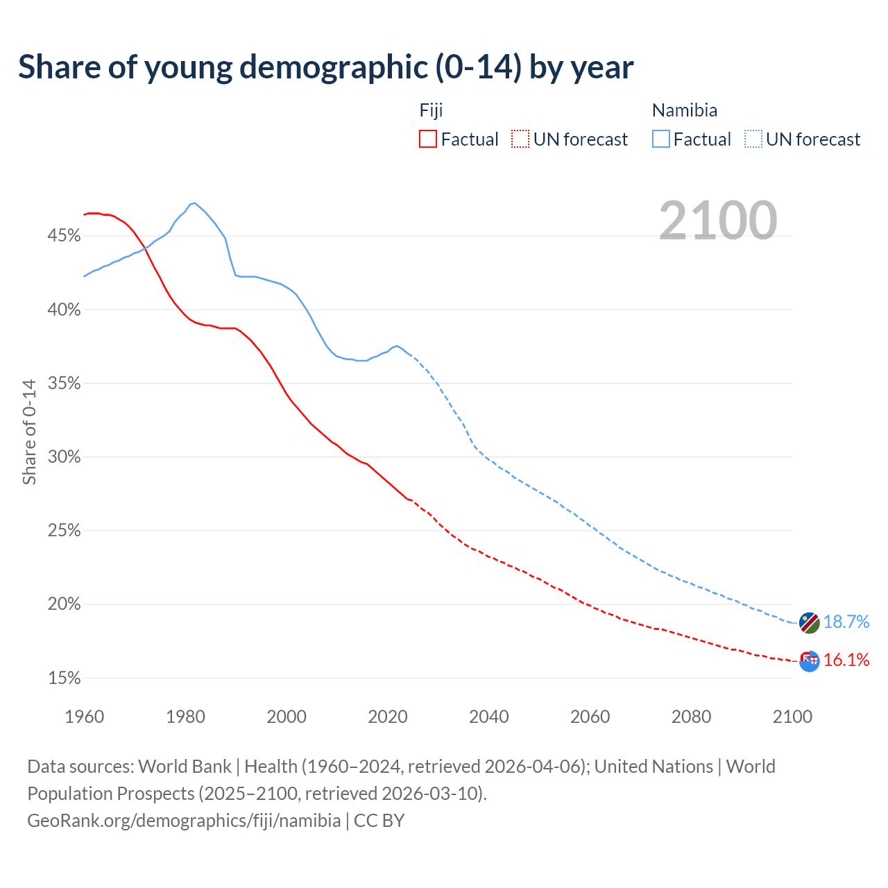 - Fiji is ranked 113/196 by median age (oldest to youngest) vs 147/196 for Namibia.