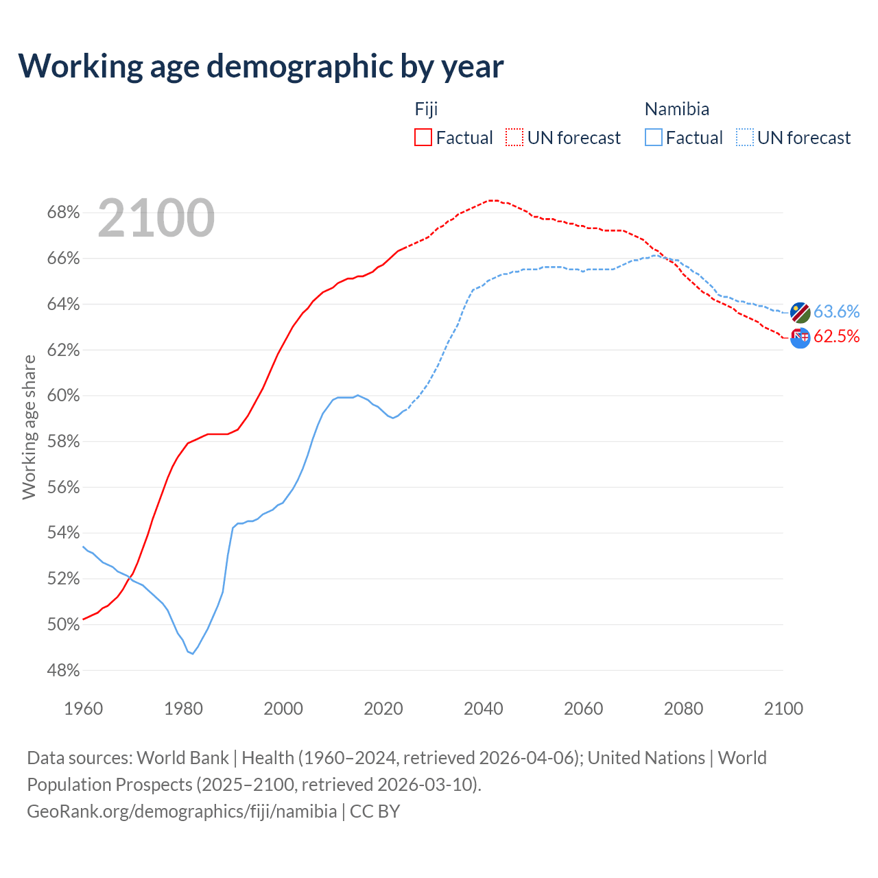 - Fiji has 623K working age adults (aged 15-64) vs 1.88M in Namibia.
