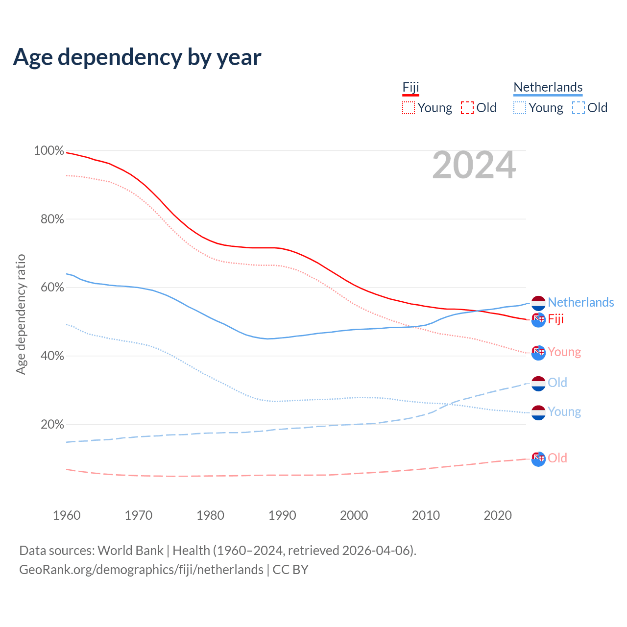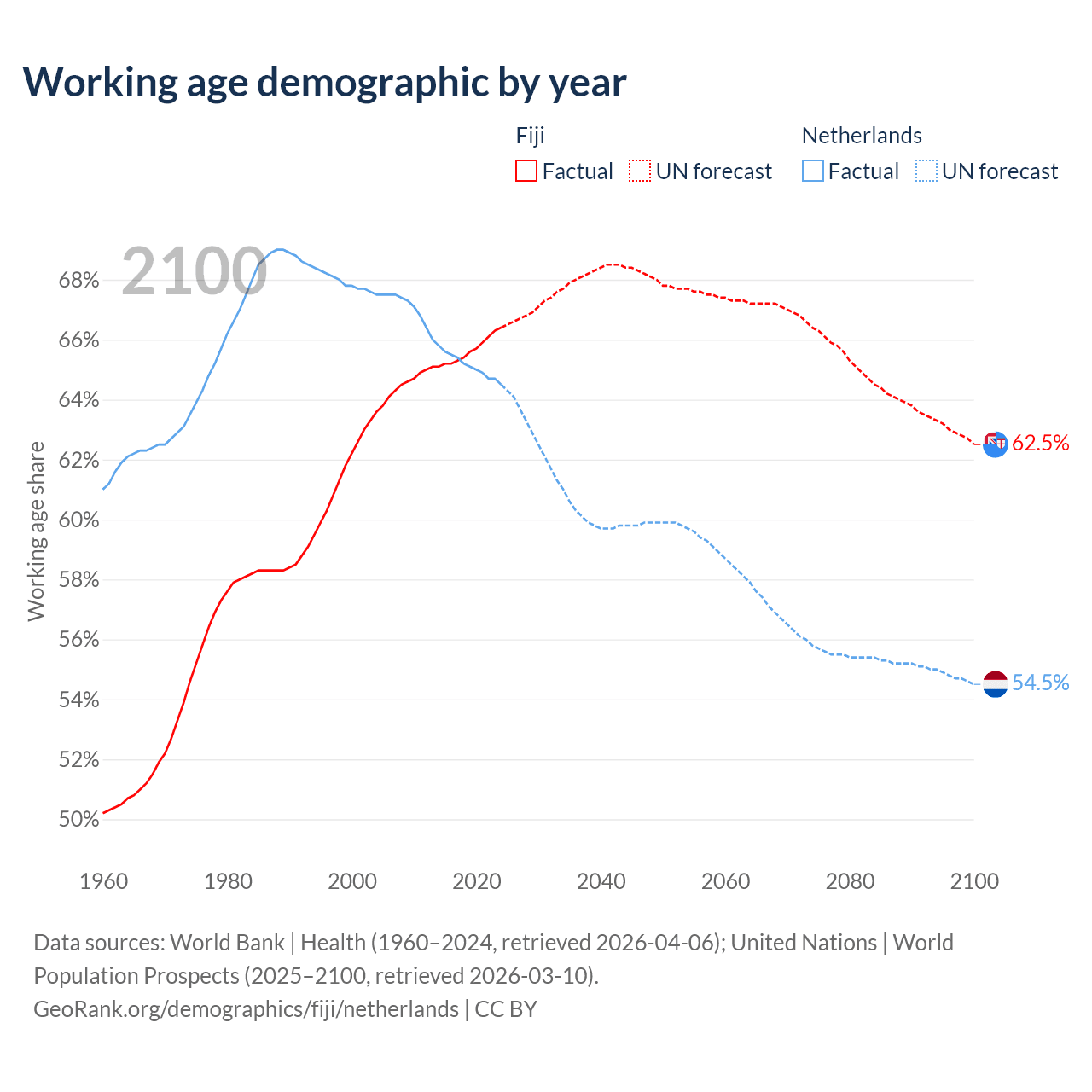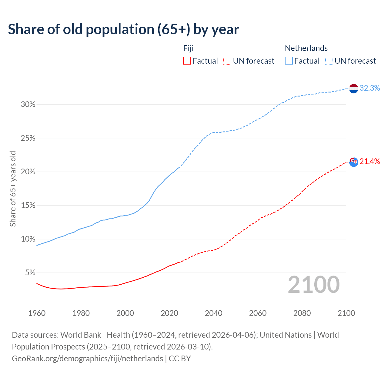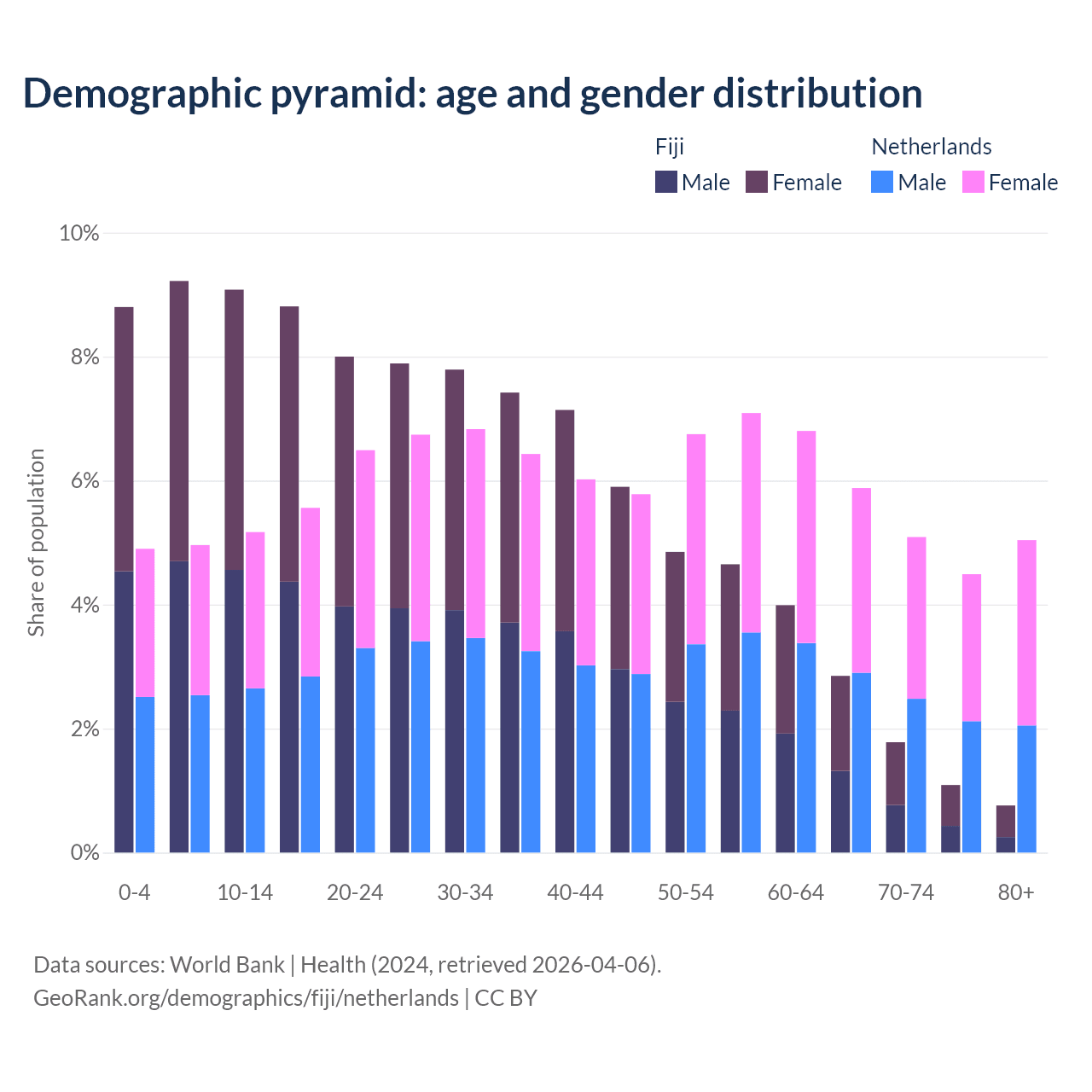 - The share of old-age demographic (65+) in Fiji is 6.49% vs 20.5% in the Netherlands.
