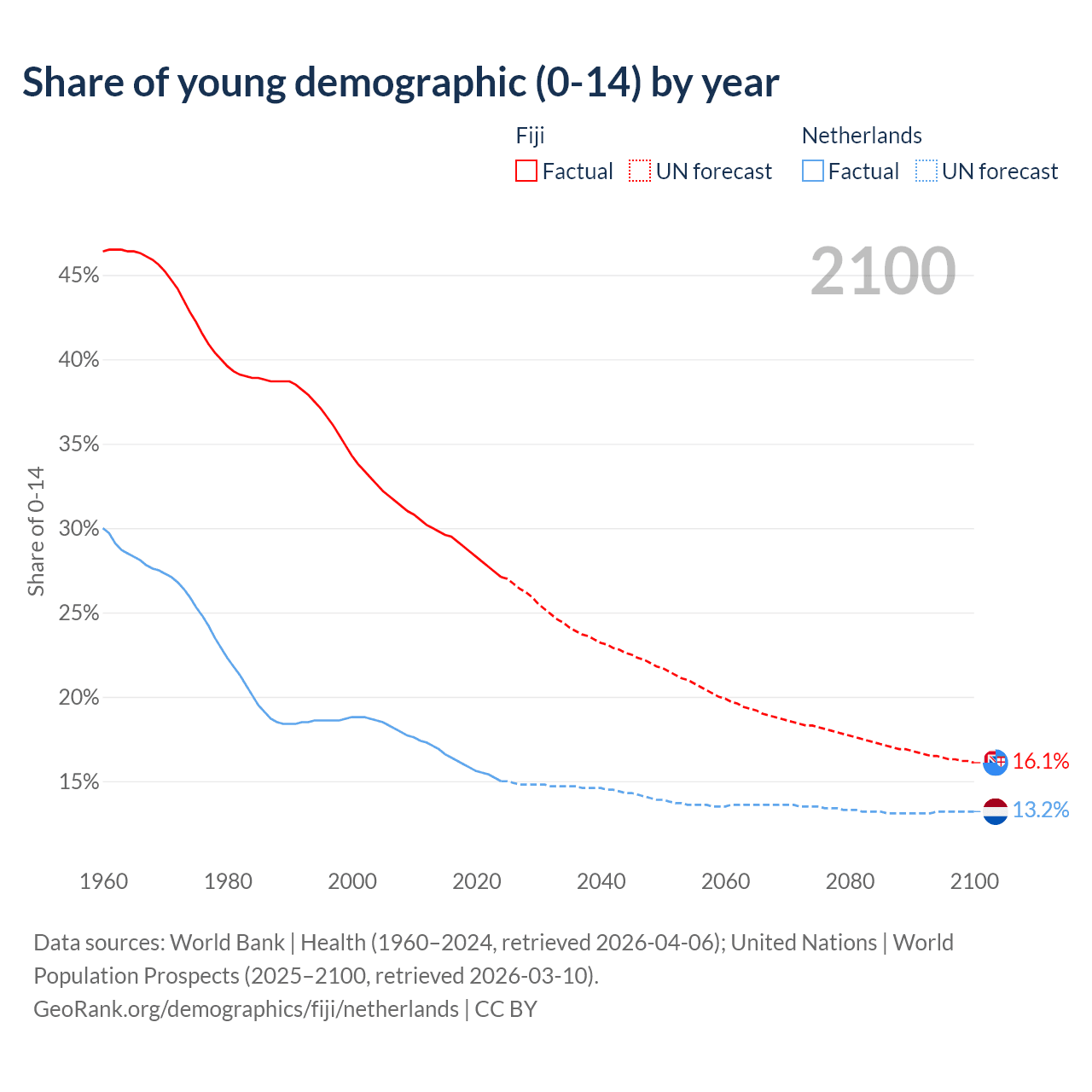 - The share of young demographic (0-15 years old) in Fiji is 27.1% vs 15% in the Netherlands.