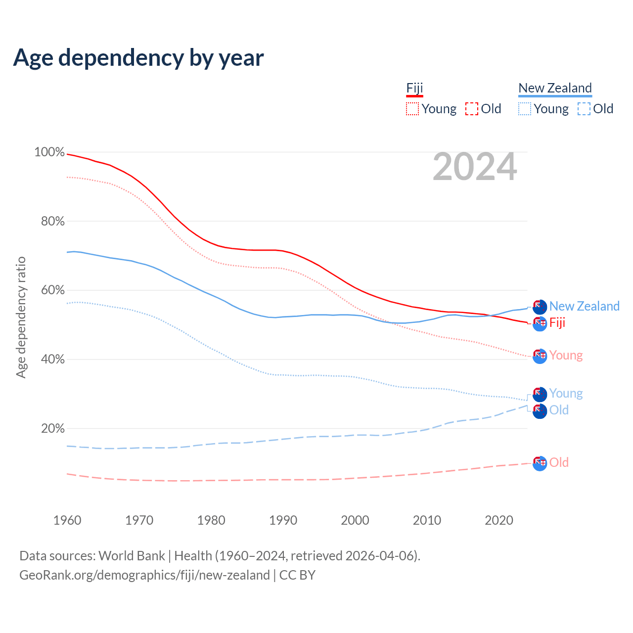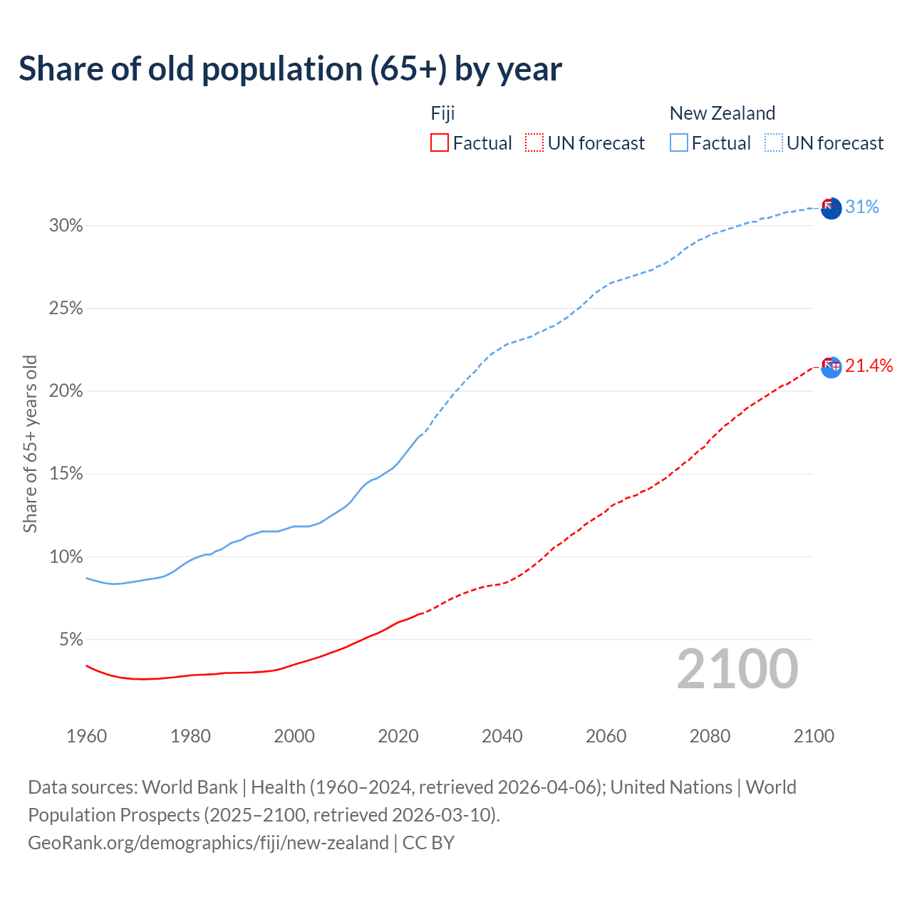 The share of older people aged 65 and over is 6.49% in Fiji and 17.2% in New Zealand. Life expectancy in Fiji compared to New Zealand .