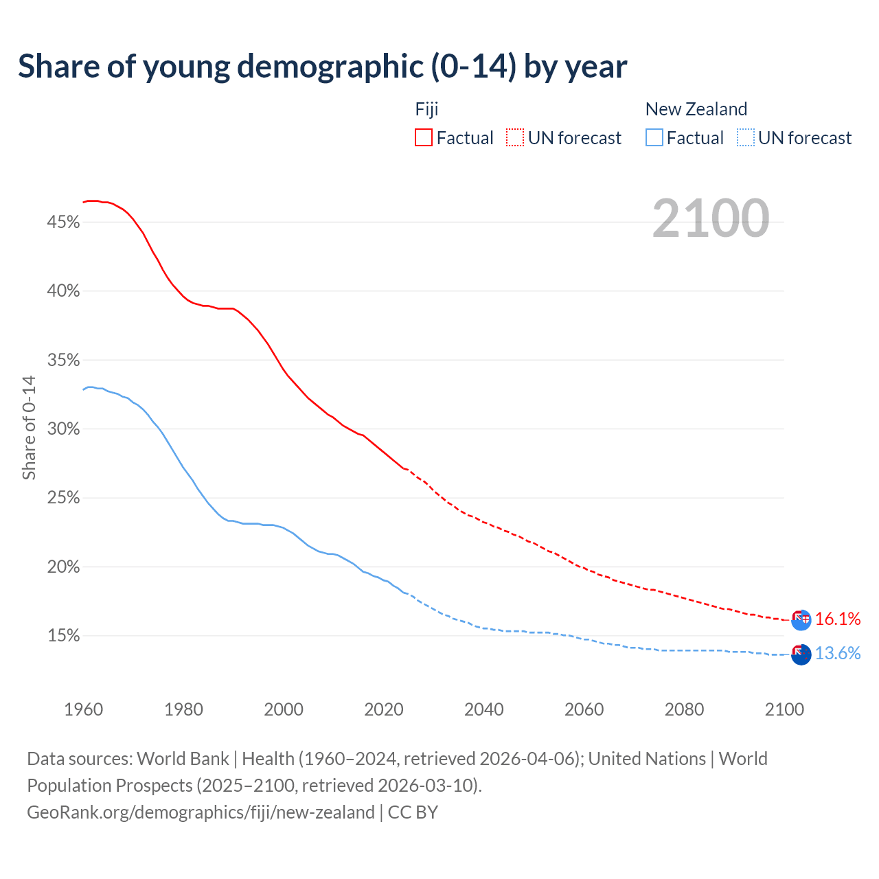 - The share of young demographic (0-15 years old) in Fiji is 27.1% vs 18.1% in New Zealand.