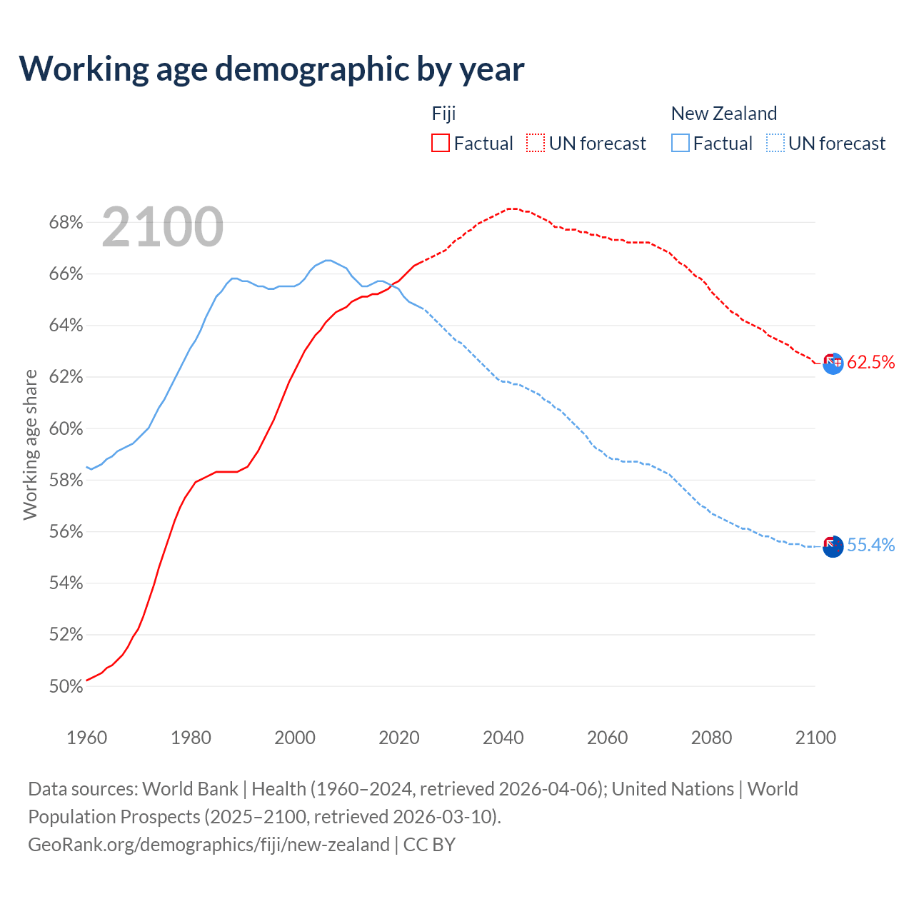 Median age Fiji vs New Zealand, 1960-2100