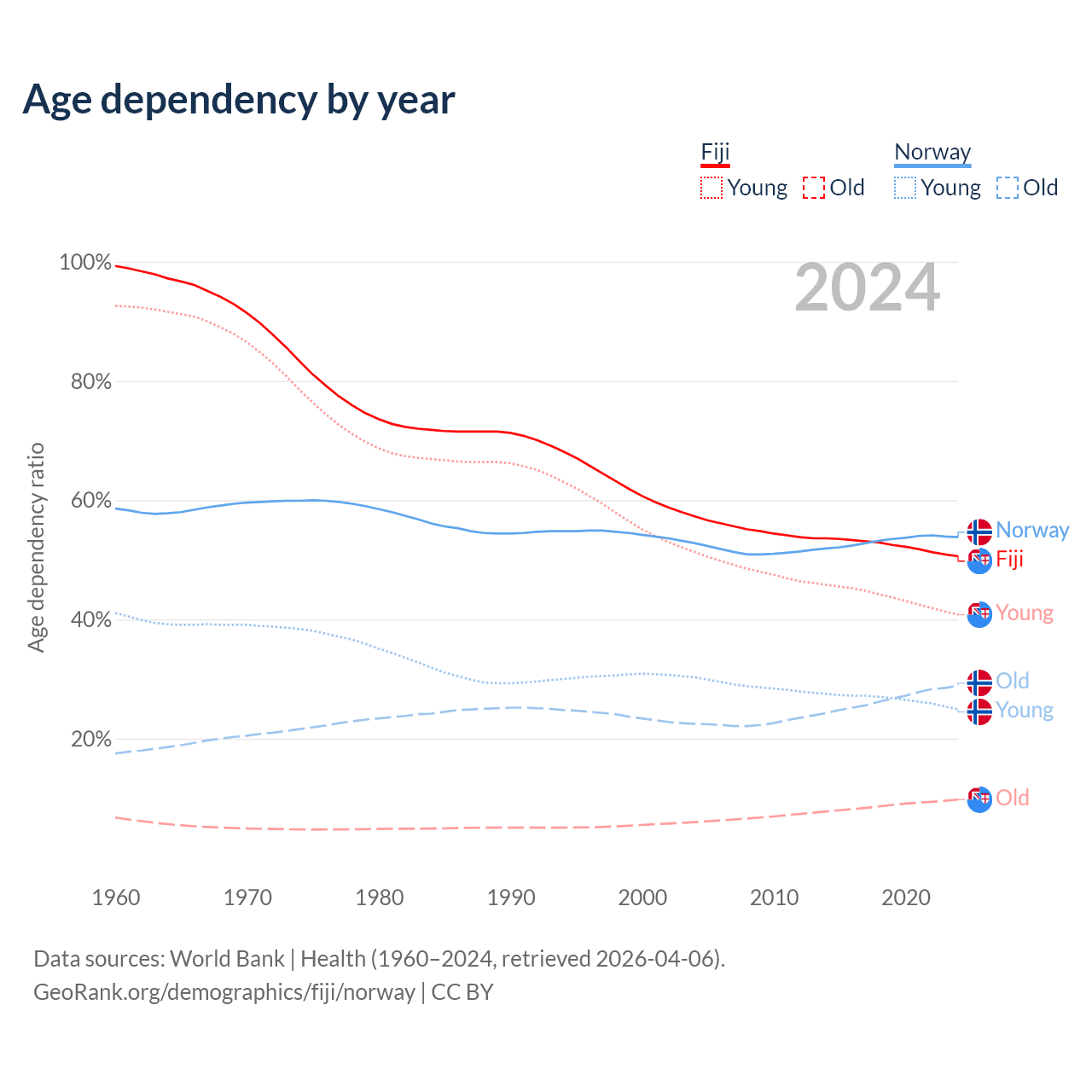 - The share of young demographic (0-15 years old) in Fiji is 27.1% vs 16.2% in Norway.