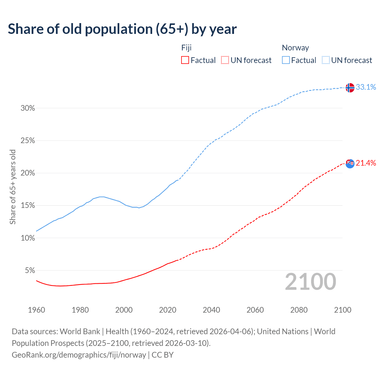 - The share of old-age demographic (65+) in Fiji is 6.49% vs 18.8% in Norway.