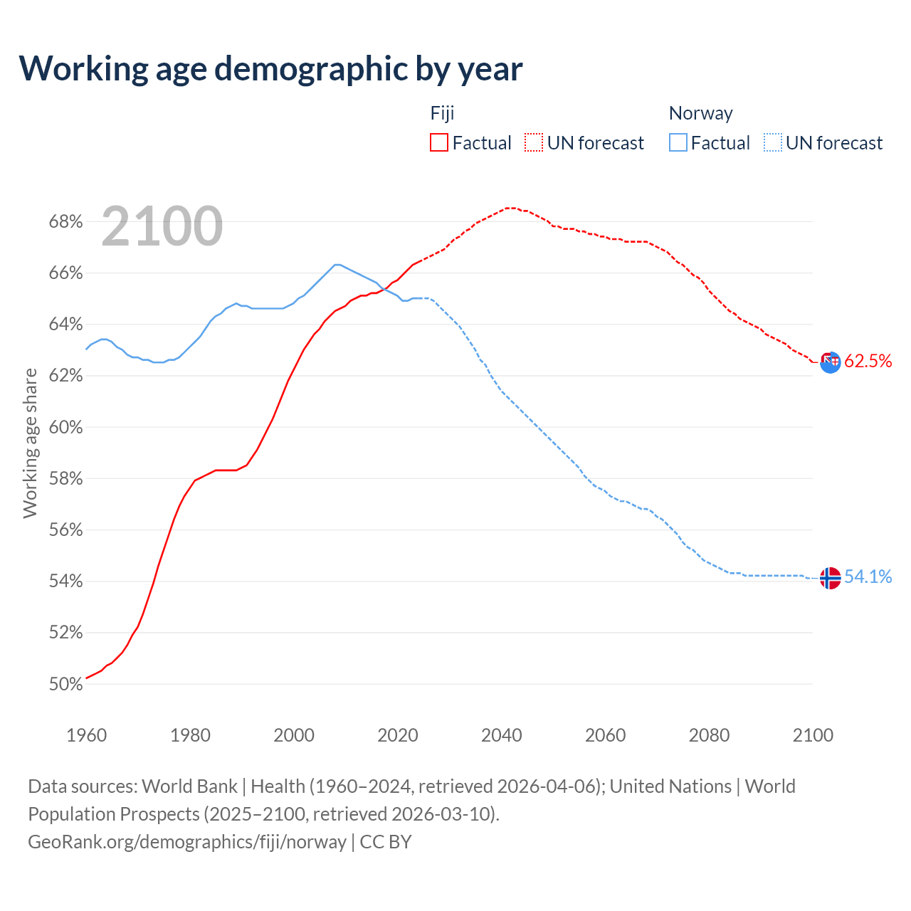 - Fiji has 623K working age adults (aged 15-64) vs 3.69M in Norway.