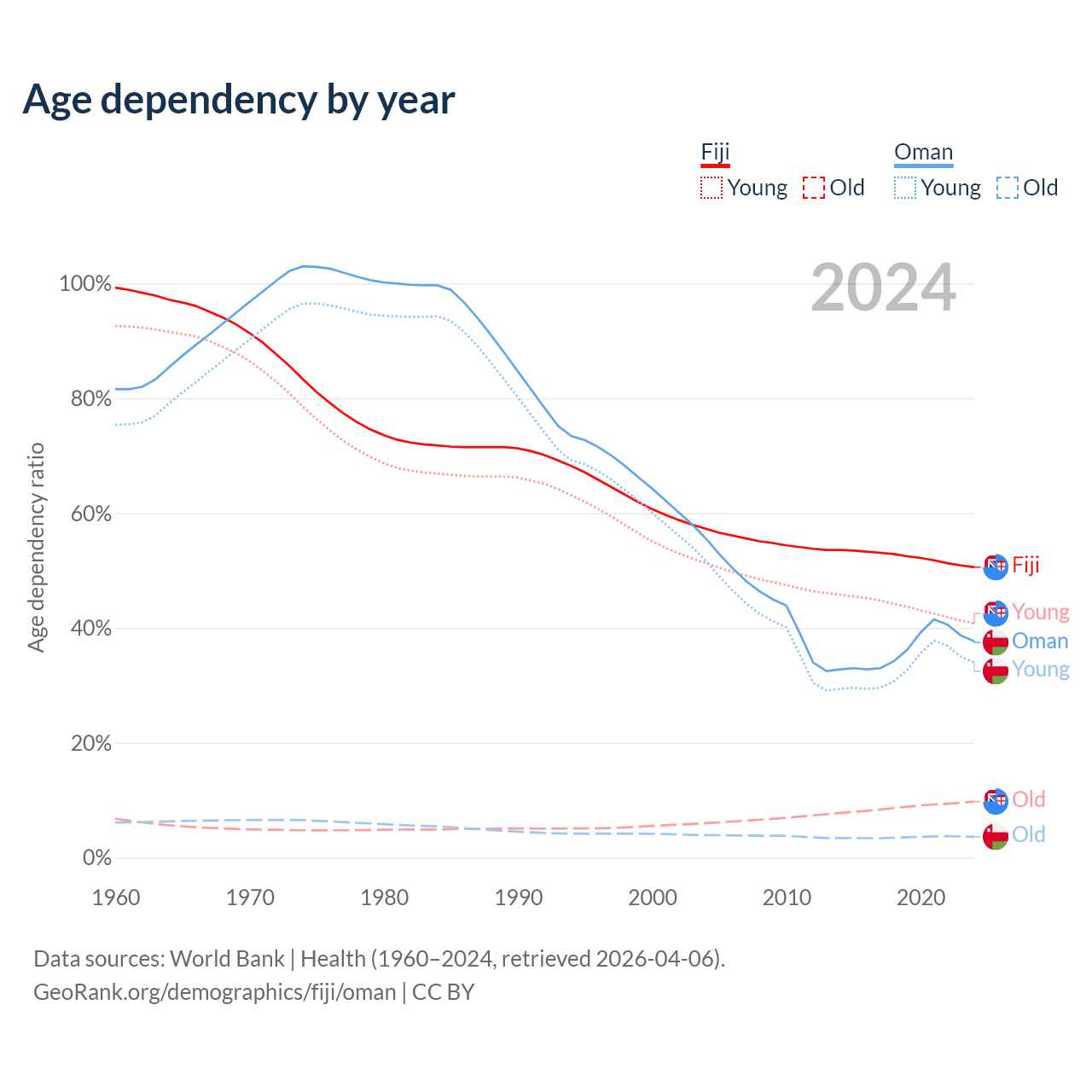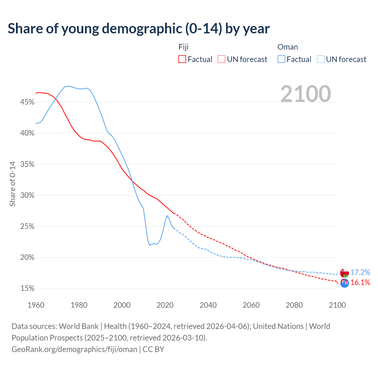 - The share of young demographic (0-15 years old) in Fiji is 27.1% vs 24.7% in Oman.