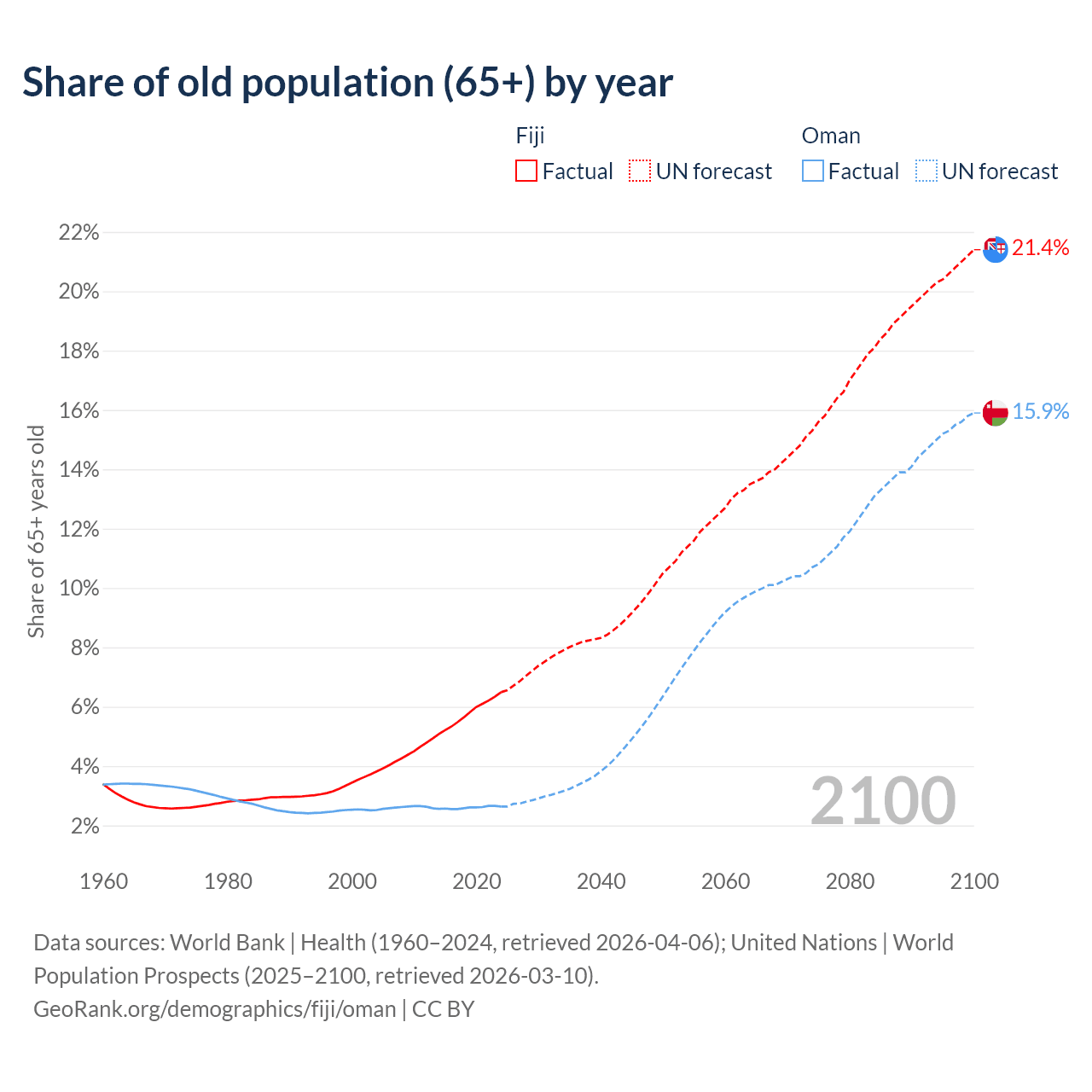 - The share of old-age demographic (65+) in Fiji is 6.49% vs 2.64% in Oman.