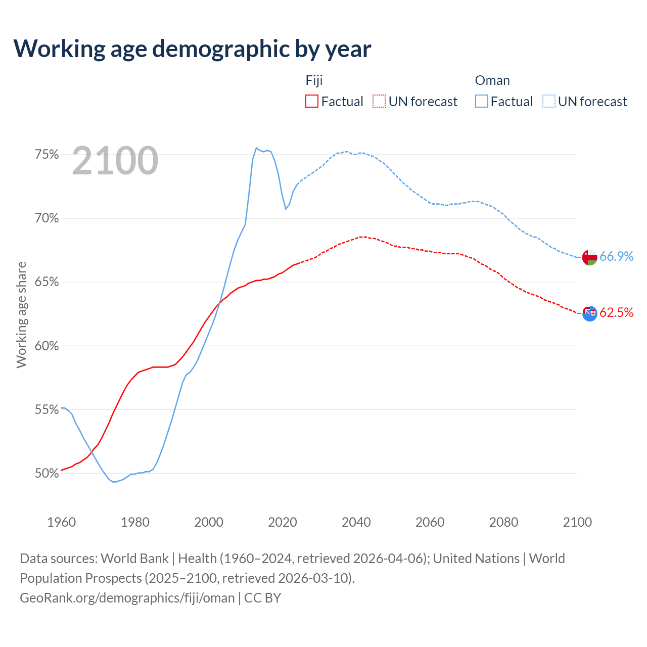 - Fiji has 623K working age adults (aged 15-64) vs 4.19M in Oman.