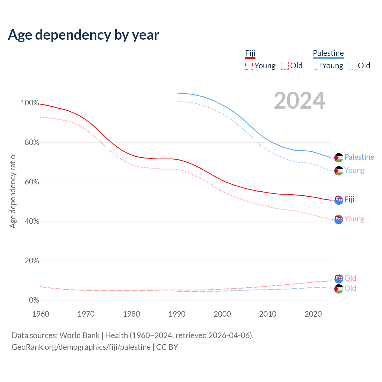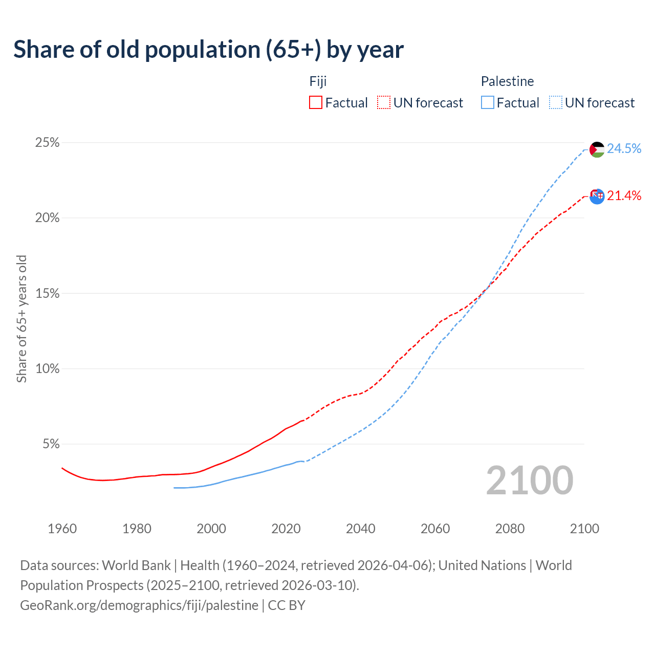 - The share of old-age demographic (65+) in Fiji is 6.49% vs 3.84% in Palestine.
