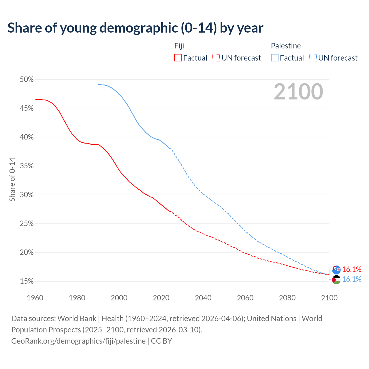 - The share of young demographic (0-15 years old) in Fiji is 27.1% vs 38% in Palestine.