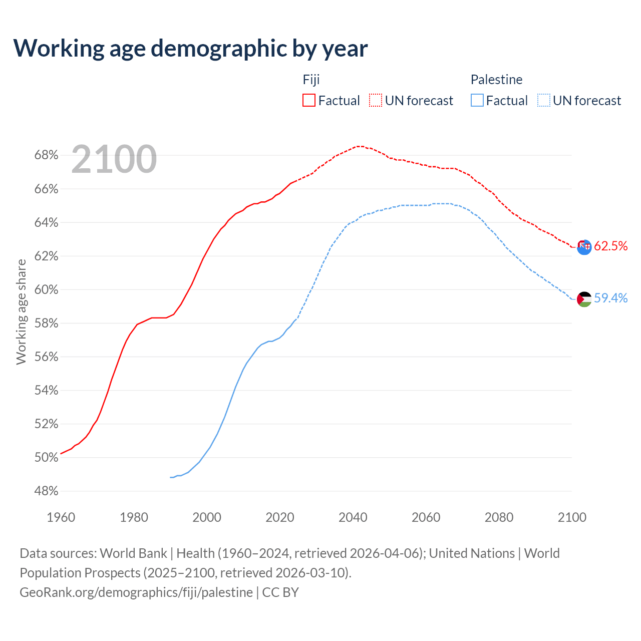 - Fiji has 623K working age adults (aged 15-64) vs 3.2M in Palestine.