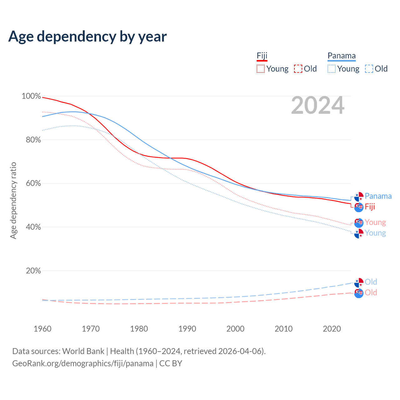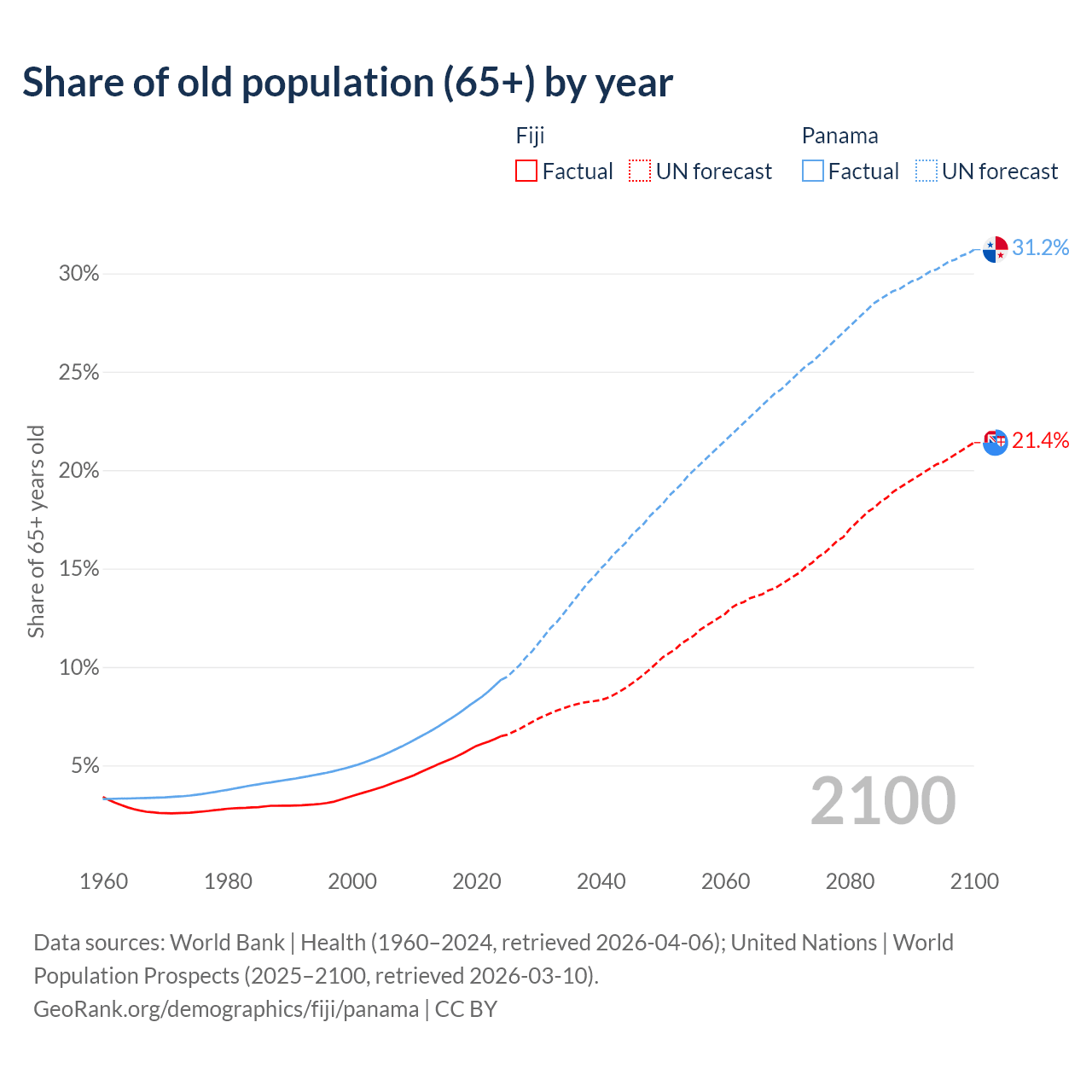 - The share of old-age demographic (65+) in Fiji is 6.49% vs 9.35% in Panama.