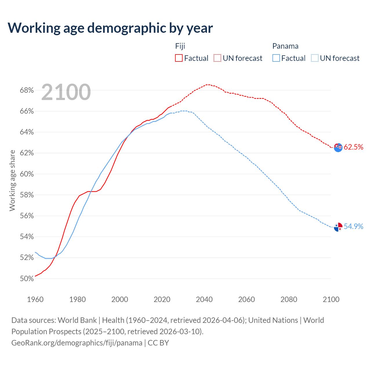- Fiji has 623K working age adults (aged 15-64) vs 3.05M in Panama.