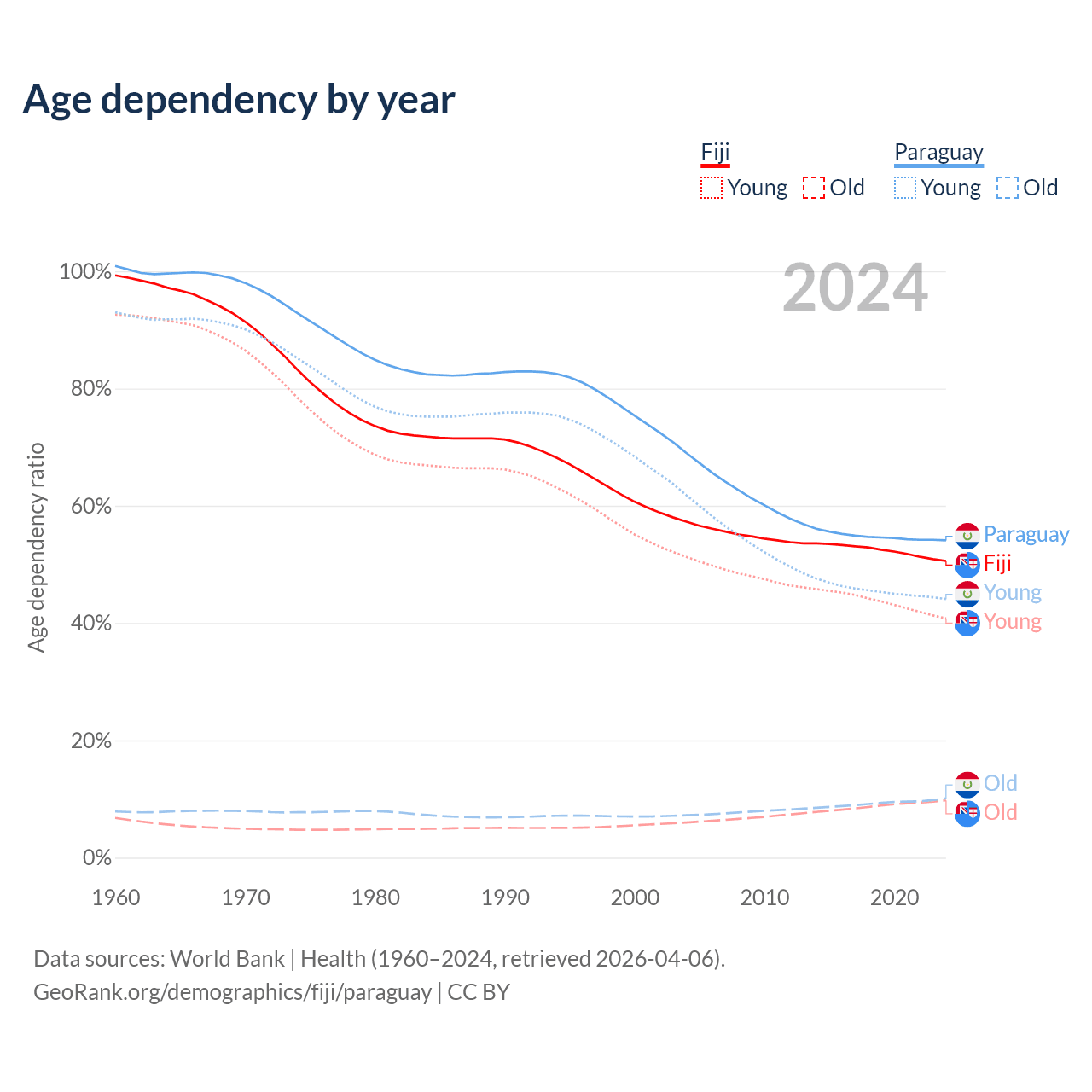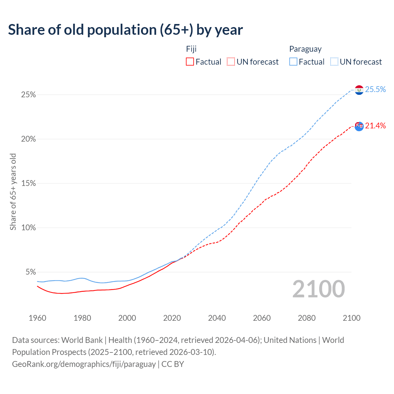 - The share of old-age demographic (65+) in Fiji is 6.49% vs 6.54% in Paraguay.