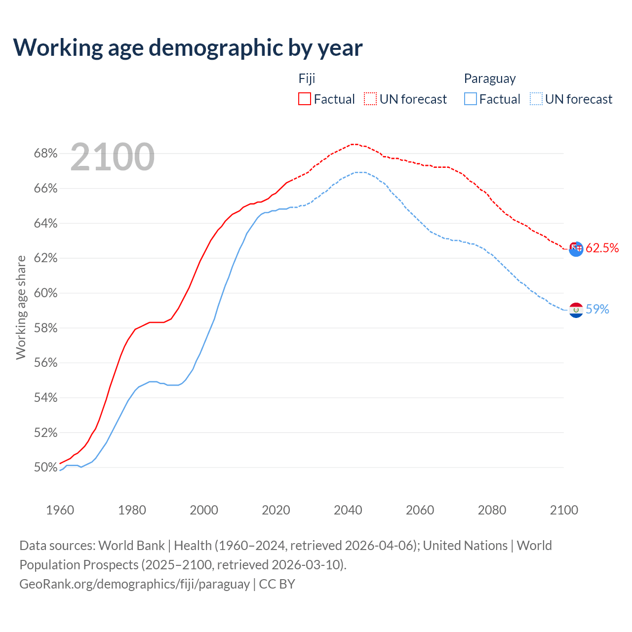 Median age Fiji vs Paraguay, 1960-2100