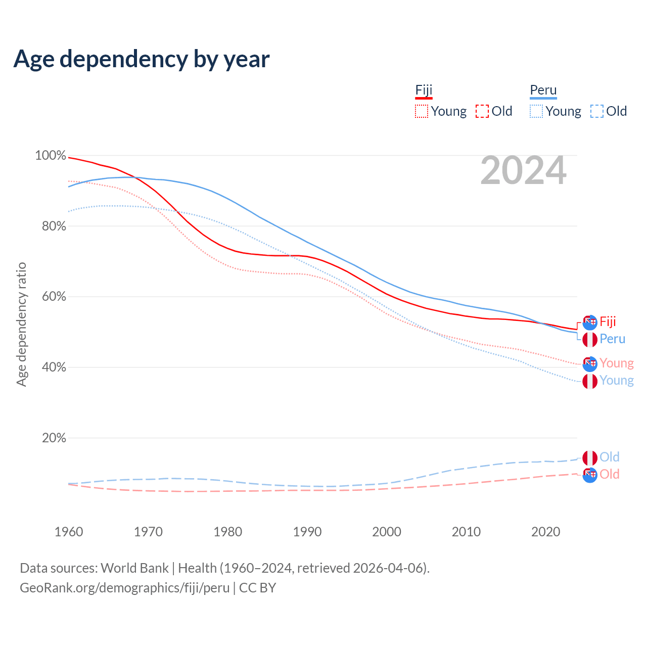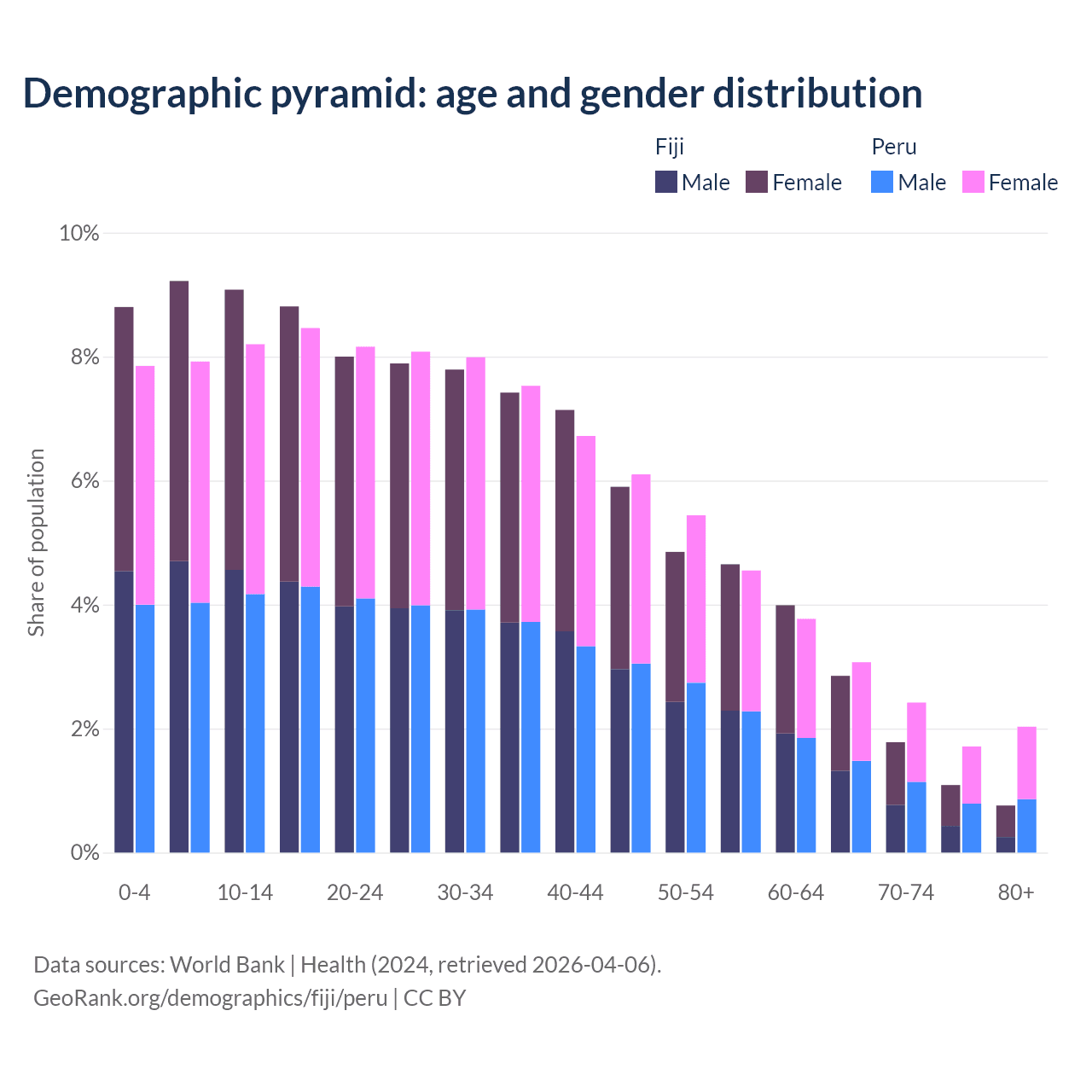 - The share of old-age demographic (65+) in Fiji is 6.49% vs 9.23% in Peru.