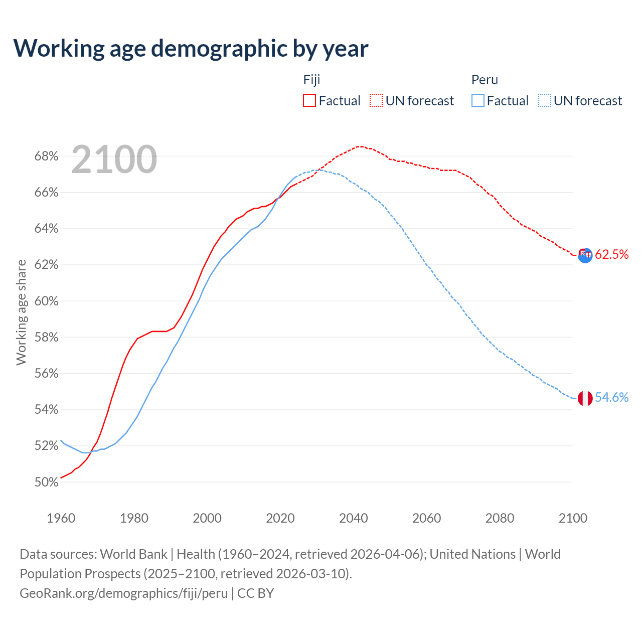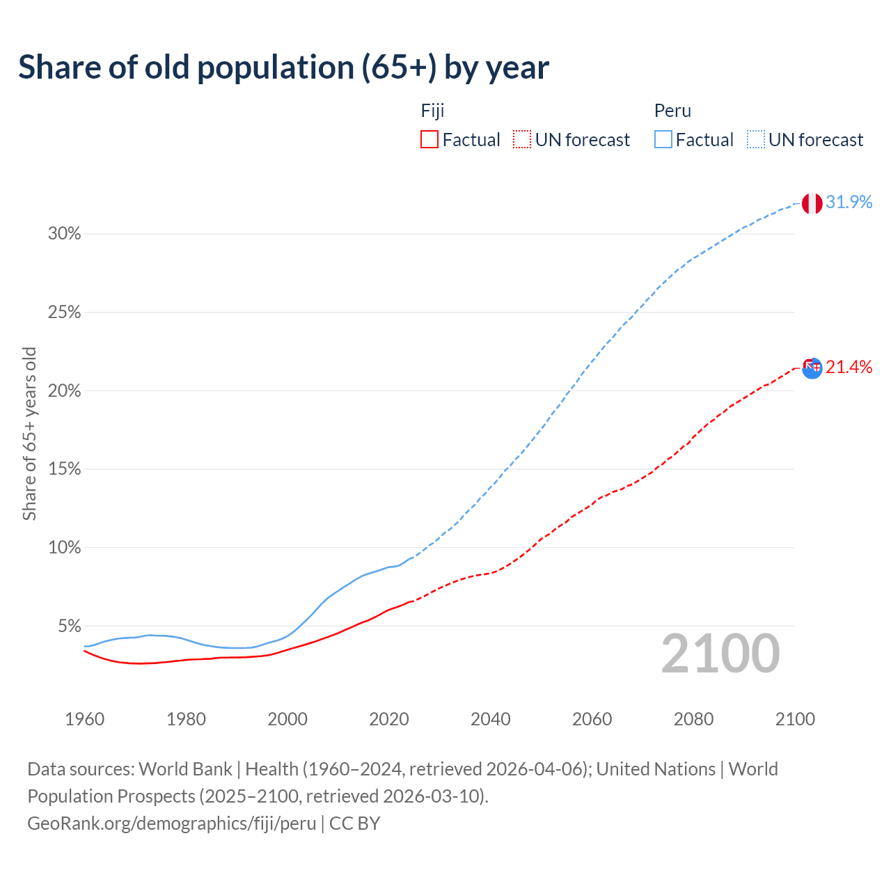 The share of older people aged 65 and over is 6.49% in Fiji and 9.23% in Peru. Life expectancy in Fiji compared to Peru .