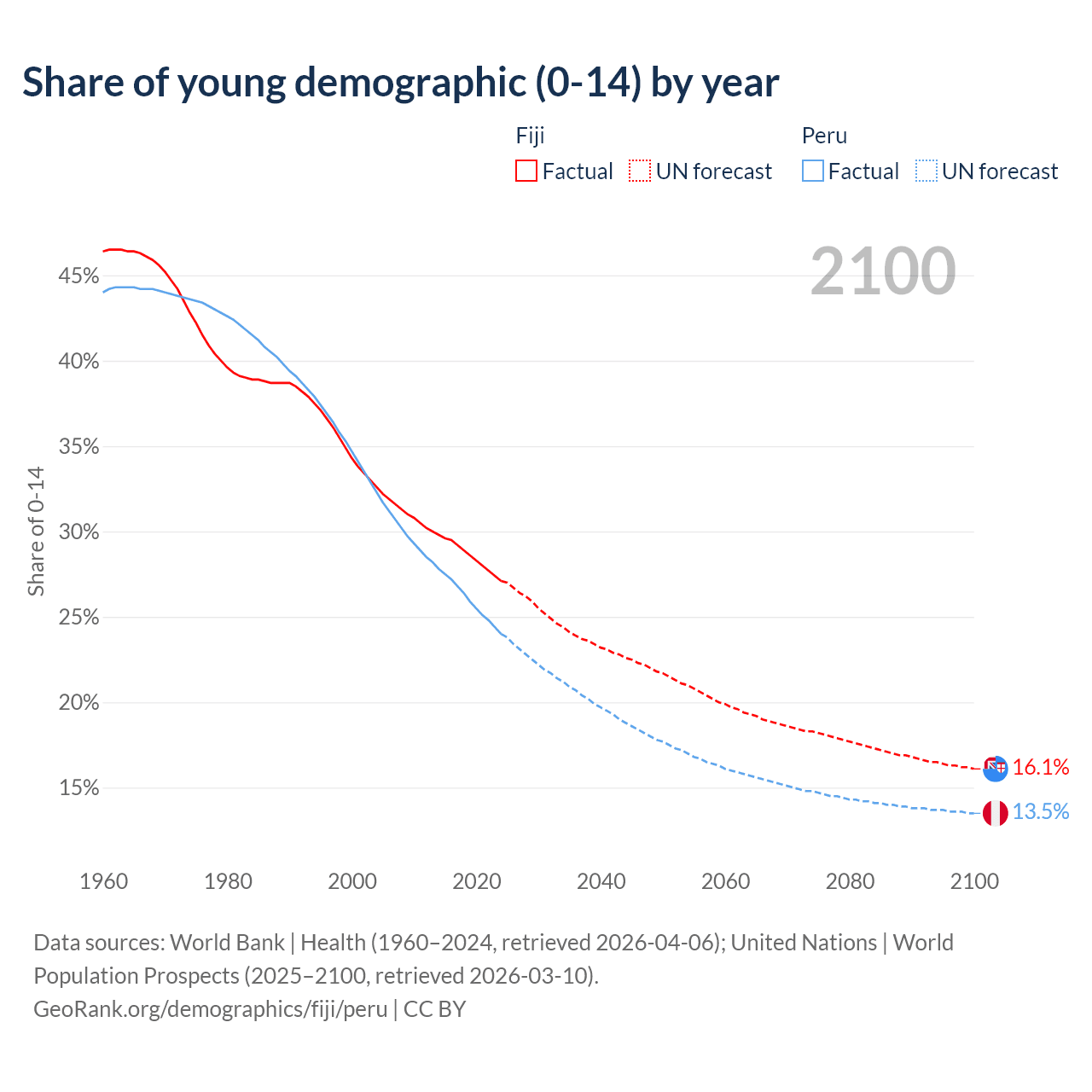 - The share of young demographic (0-15 years old) in Fiji is 27.1% vs 24% in Peru.