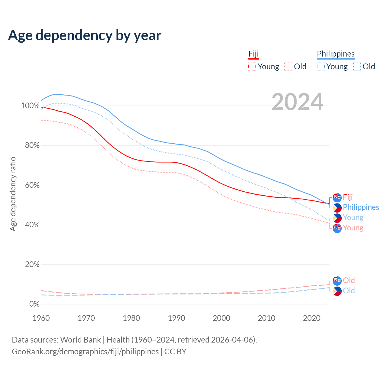 Data sources: World Bank | Health (1960–2024, retrieved 2026-04-06); U.S. Census Bureau (1960–2024, retrieved 2026-02-08).