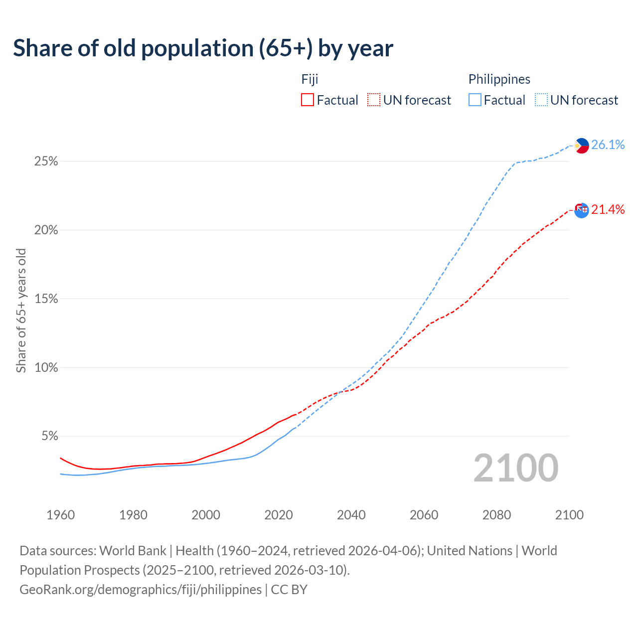 The share of older people aged 65 and over is 6.49% in Fiji and 5.49% in the Philippines. Life expectancy in Fiji compared to the Philippines .