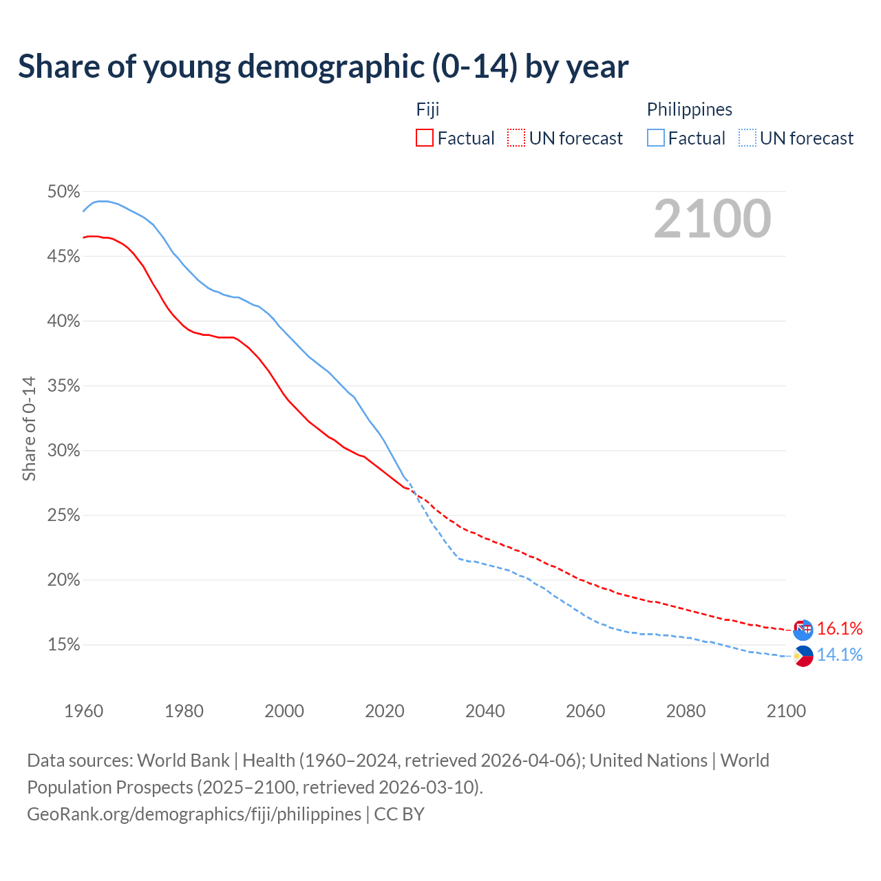 - The share of young demographic (0-15 years old) in Fiji is 27.1% vs 27.9% in the Philippines.